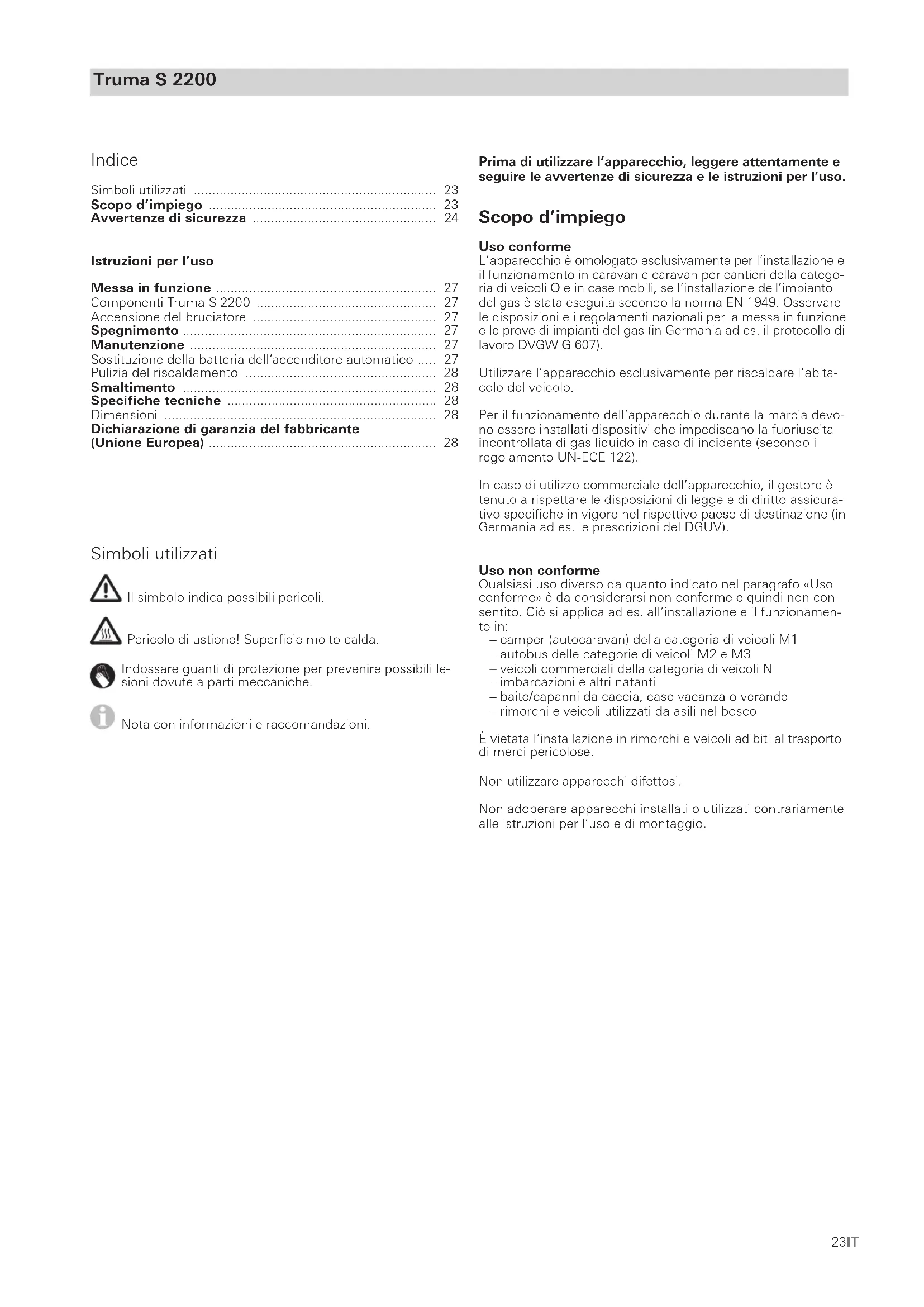 - Le recours en garantie doit être formé auprès d’un partenaire SAV agréé ou du centre de service après-vente Truma. Vous trou- verez adresses et numéros de téléphone sur www.truma.com à la rubrique « Service ». Adresse du fabricant: Truma Gerätetechnik GmbH & Co. KG Truma Servicezentrum Wernher-von-Braun-Straße 12 85640 Putzbrunn, Allemagne Afin d’assurer le bon déroulement de la garantie, prière de fournir les informations suivantes au moment où vous pren- drez contact: – description détaillée du défaut – numéro de série de l’appareil – date d’achat Le partenaire SAV agréé ou le centre de service après-vente Truma décideront au cas par cas de la marche à suivre. Afin de prévenir tous dommages dus au transport, l’appareil ne devra être expédié qu’après concertation avec le partenaire SAV agréé ou le centre de service après-vente Truma. Si le recours en garantie est accepté par le fabricant, ce der- nier prend en charge les frais de transport. Si le dommage n’est pas couvert par la garantie, le consommateur en sera informé et les frais de réparation et de transport seront à sa charge. Prière de ne rien retourner sans avoir pris contact avec nous au préalable.23IT Truma S 2200 Prima di utilizzare l’apparecchio, leggere attentamente e seguire le avvertenze di sicurezza e le istruzioni per l’uso. Scopo d’impiego Uso conforme L’apparecchio è omologato esclusivamente per l’installazione e il funzionamento in caravan e caravan per cantieri della catego- ria di veicoli O e in case mobili, se l’installazione dell’impianto del gas è stata eseguita secondo la norma EN 1949. Osservare le disposizioni e i regolamenti nazionali per la messa in funzione e le prove di impianti del gas (in Germania ad es. il protocollo di lavoro DVGW G 607). Utilizzare l’apparecchio esclusivamente per riscaldare l’abita- colo del veicolo. Per il funzionamento dell’apparecchio durante la marcia devo- no essere installati dispositivi che impediscano la fuoriuscita incontrollata di gas liquido in caso di incidente (secondo il regolamento UN-ECE 122). In caso di utilizzo commerciale dell’apparecchio, il gestore è tenuto a rispettare le disposizioni di legge e di diritto assicura- tivo specifiche in vigore nel rispettivo paese di destinazione (in Germania ad es. le prescrizioni del DGUV). Uso non conforme Qualsiasi uso diverso da quanto indicato nel paragrafo «Uso conforme» è da considerarsi non conforme e quindi non con- sentito. Ciò si applica ad es. all’installazione e il funzionamen- to in: – camper (autocaravan) della categoria di veicoli M1 – autobus delle categorie di veicoli M2 e M3 – veicoli commerciali della categoria di veicoli N – imbarcazioni e altri natanti – baite/capanni da caccia, case vacanza o verande – rimorchi e veicoli utilizzati da asili nel bosco È vietata l’installazione in rimorchi e veicoli adibiti al trasporto di merci pericolose. Non utilizzare apparecchi difettosi. Non adoperare apparecchi installati o utilizzati contrariamente alle istruzioni per l’uso e di montaggio. Simboli utilizzati Il simbolo indica possibili pericoli. Pericolo di ustione! Superficie molto calda. Indossare guanti di protezione per prevenire possibili le- sioni dovute a parti meccaniche. Nota con informazioni e raccomandazioni. Indice Simboli utilizzati p. 23