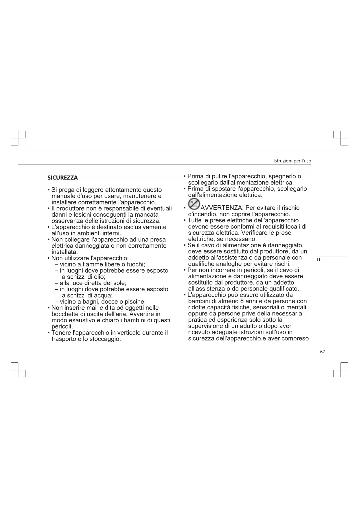 AVVERTENZA: Per evitare il rischio d'incendio, non coprire l'apparecchio.