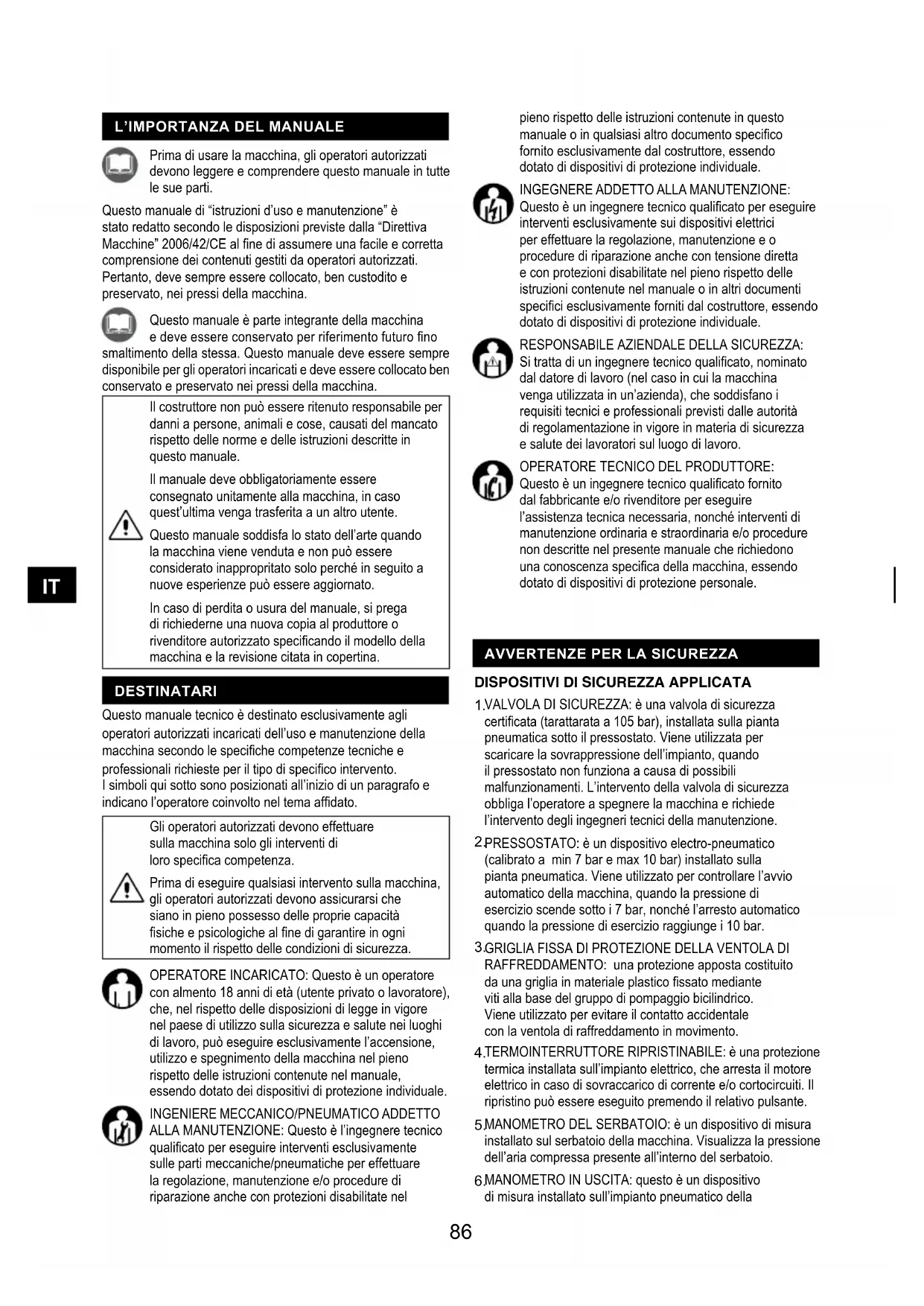 ALLA MANUTENZIONE: Questo è l’ingegnere tecnico qualicato per eseguire interventi esclusivamente sulle parti meccaniche/pneumatiche per effettuare la regolazione, manutenzione e/o procedure di riparazione anche con protezioni disabilitate nel Questo manuale tecnico è destinato esclusivamente agli operatori autorizzati incaricati dell’uso e manutenzione della macchina secondo le speciche competenze tecniche e professionali richieste per il tipo di specico intervento. I simboli qui sotto sono posizionati all’inizio di un paragrafo e indicano l’operatore coinvolto nel tema afdato. Questo manuale è parte integrante della macchina e deve essere conservato per riferimento futuro no smaltimento della stessa. Questo manuale deve essere sempre disponibile per gli operatori incaricati e deve essere collocato ben conservato e preservato nei pressi della macchina. Prima di usare la macchina, gli operatori autorizzati devono leggere e comprendere questo manuale in tutte le sue parti. Questo manuale di “istruzioni d’uso e manutenzione” è stato redatto secondo le disposizioni previste dalla “Direttiva Macchine” 2006/42/CE al ne di assumere una facile e corretta comprensione dei contenuti gestiti da operatori autorizzati. Pertanto, deve sempre essere collocato, ben custodito e preservato, nei pressi della macchina.