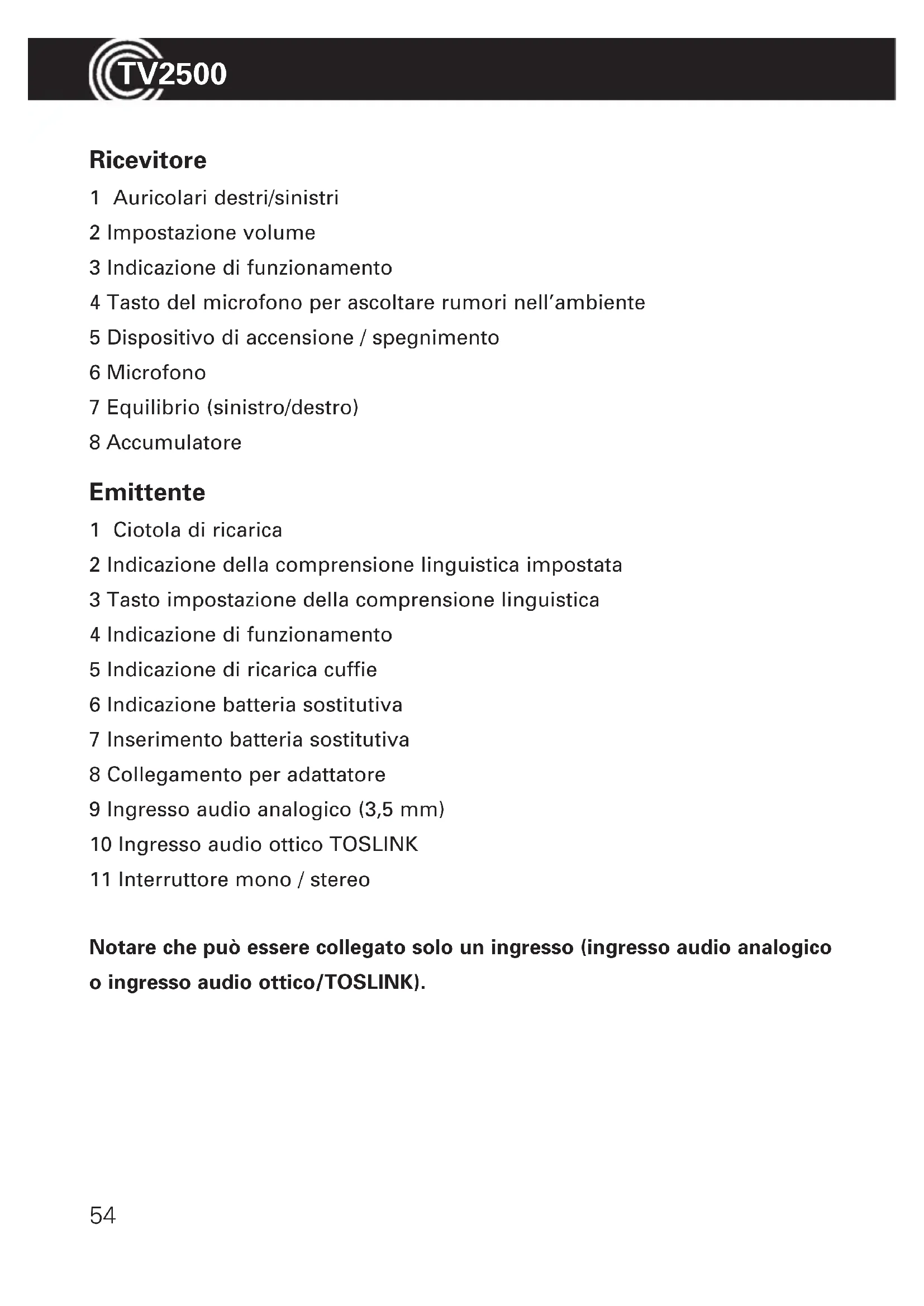 Ricevitore 1 Auricolari destri/sinistri 2 Impostazione volume 3 Indicazione di funzionamento 4 Tasto del microfono per ascoltare rumori nell’ambiente 5 Dispositivo di accensione / spegnimento 6 Microfono 7 Equilibrio (sinistro/destro) 8 Accumulatore Emittente 1 Ciotola di ricarica 2 Indicazione della comprensione linguistica impostata 3 Tasto impostazione della comprensione linguistica 4 Indicazione di funzionamento 5 Indicazione di ricarica cuffie 6 Indicazione batteria sostitutiva 7 Inserimento batteria sostitutiva 8 Collegamento per adattatore 9 Ingresso audio analogico (3,5 mm) 10 Ingresso audio ottico TOSLINK 11 Interruttore mono / stereo Notare che può essere collegato solo un ingresso (ingresso audio analogico o ingresso audio ottico/TOSLINK).55 Mettere in funzione TV 2500Mettere in funzione TV 2500 Contenuto del pacchetto