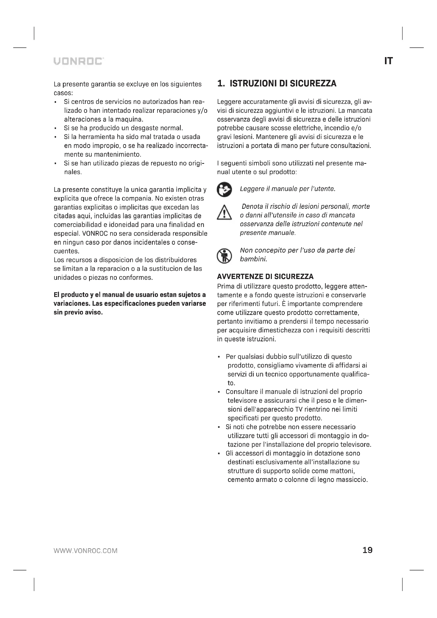 I prodotti VONROC sono sviluppati secondo i piu elevati standard di qualita e viene garantita l’assen- za di difetti nei materiali e nella manodopera per il periodo contrattuale a partire dalla data di acquisto originale. Qualora il prodotto dovesse subire un guasto qualsiasi durante questo periodo a causa di difetti nei materiali e/o nella manodopera, si prega di contattare direttamente il VONROC.22