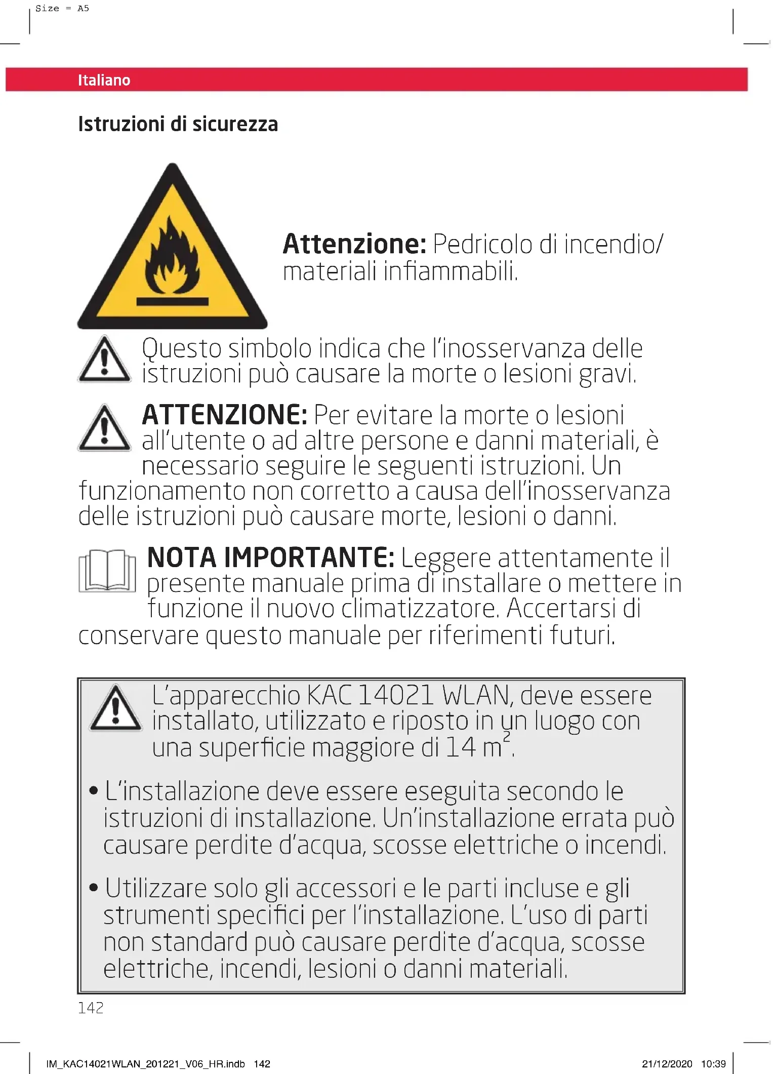 Size = A5 Istruzioni di sicurezza Attenzione: Pedricolo di incendio/ materiali infiammabili. Questo simbolo indica che l’inosservanza delle istruzioni può causare la morte o lesioni gravi. ATTENZIONE: Per evitare la morte o lesioni all’utente o ad altre persone e danni materiali, è necessario seguire le seguenti istruzioni. Un funzionamento non corretto a causa dell’inosservanza delle istruzioni può causare morte, lesioni o danni. NOTA IMPORTANTE: Leggere attentamente il presente manuale prima di installare o mettere in funzione il nuovo climatizzatore. Accertarsi di conservare questo manuale per riferimenti futuri. L’apparecchio KAC 14021 WLAN, deve essere installato, utilizzato e riposto in un luogo con una superficie maggiore di 14 m².