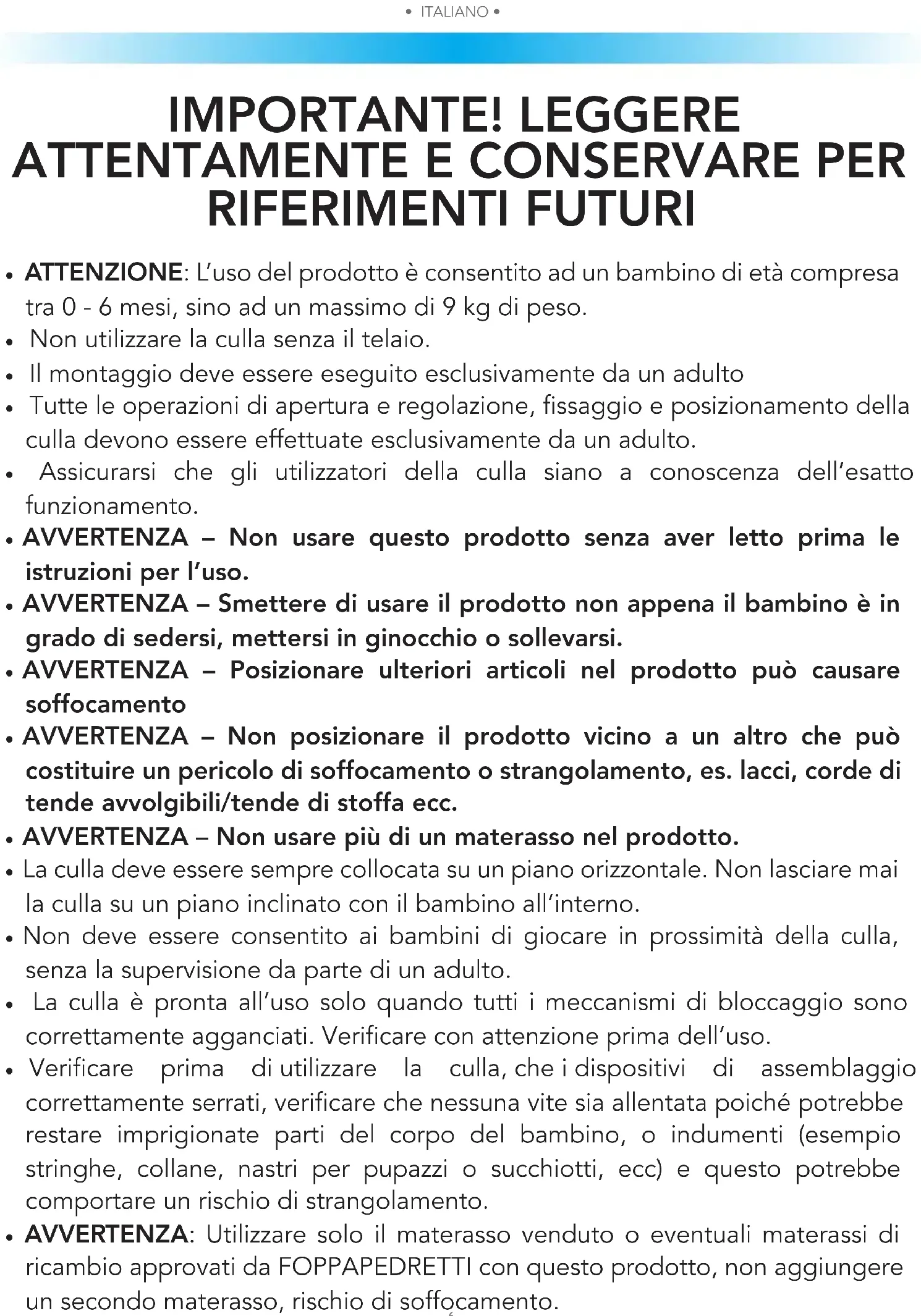 - ATTENZIONE: NON usare la culla se alcune parti sono mancanti, danneggiate o rotte. Contattare FOPPAPEDRETTI per richiedere parti di ricambio e istruzioni d’suo se necessario. NON sostituire le parti mancanti, danneggiate o rotte con componenti non originali ed approvati da FOPPAPEDRETTI.