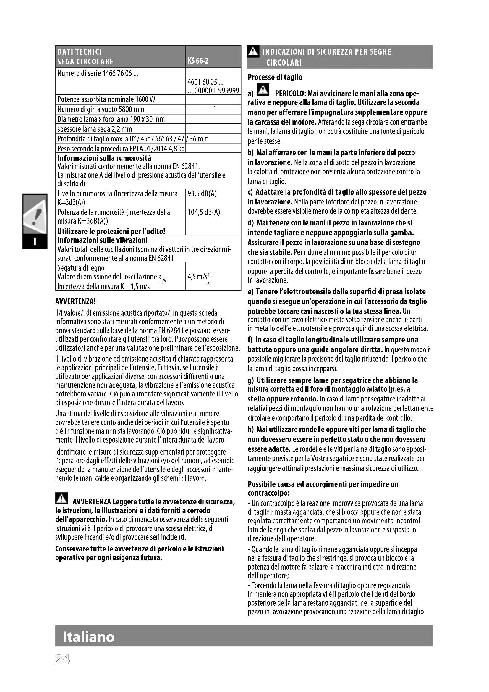 DATI TECNICI SEGA CIRCOLARE KS 66-2 Numero di serie 4466 76 06 ...
