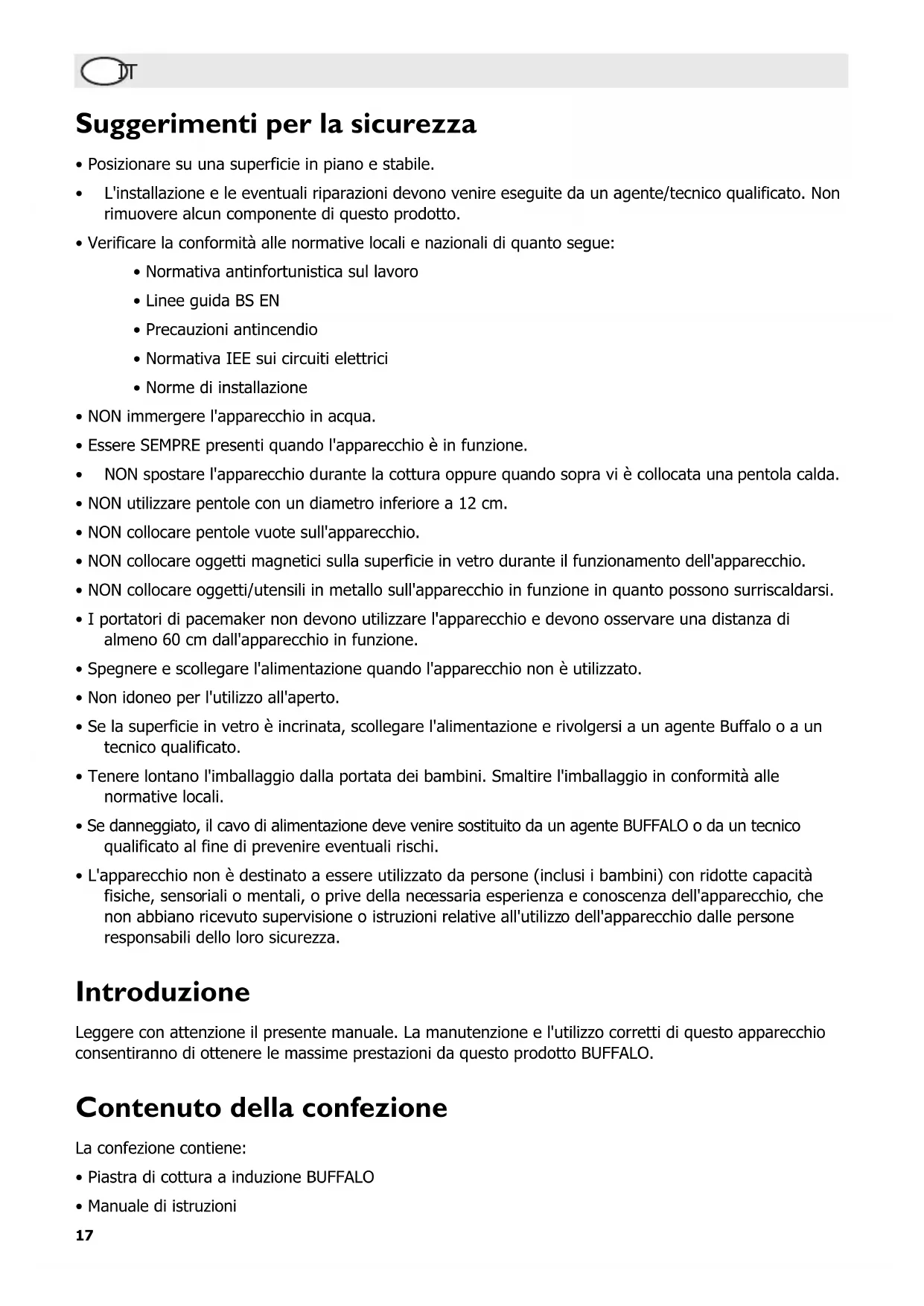 - Manuale di istruzioni18 UKIT Helpline telefonica: 0845 146 2887 (Regno Unito) BUFFALO garantisce una qualità e un servizio impeccabili e assicura che al momento dell'imballaggio tutti i componenti forniti sono integralmente funzionanti e privi di difetti. Nel caso siano rilevati danni risultanti dal trasporto del prodotto, rivolgersi immediatamente al rivenditore BUFFALO locale. Montaggio Osservare una distanza di 15 cm tra l'apparecchio e le pareti o altri oggetti circostanti. Funzionamento Pentole I recipienti adatti alla cottura includono pentole in:
