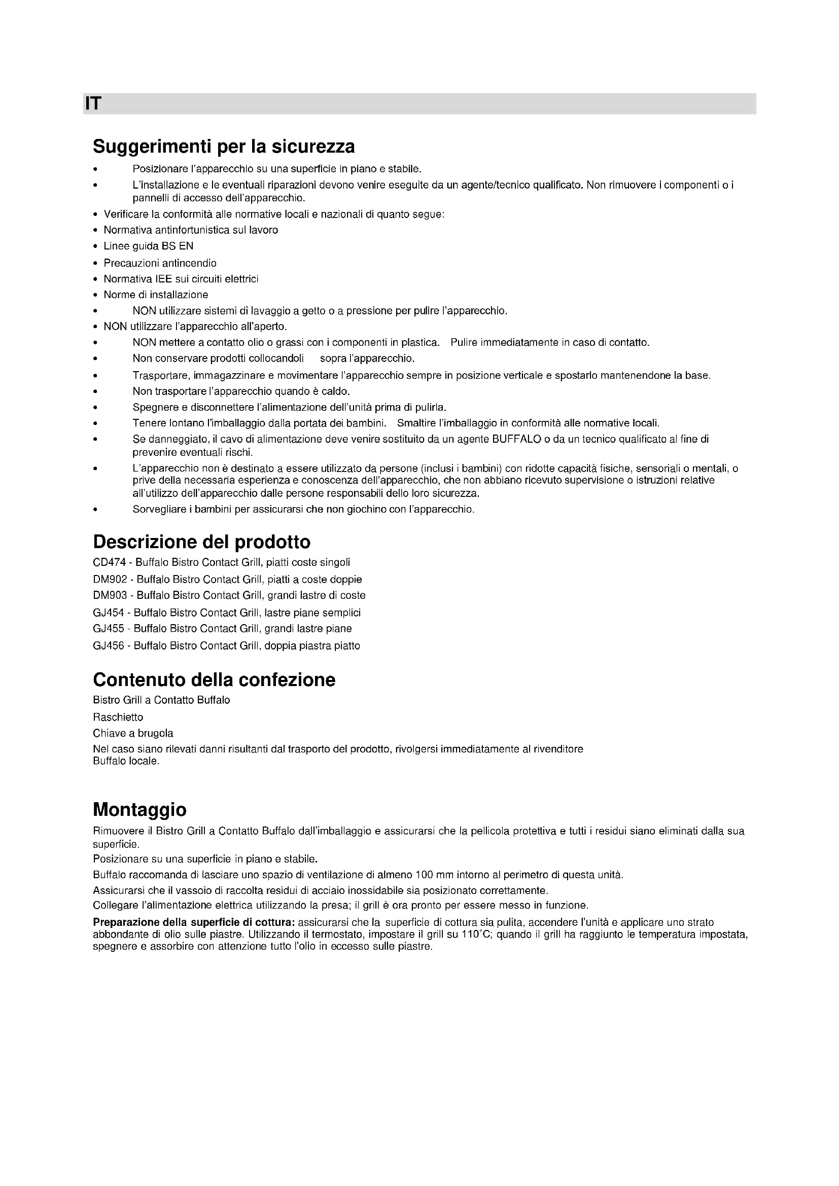 Montaggio Rimuovere il Bistro Grill a Contatto Buffalo dall’imballaggio e assicurarsi che la pellicola protettiva e tutti i residui siano eliminati dalla sua superficie. Posizionare su una superficie in piano e stabile. Buffalo raccomanda di lasciare uno spazio di ventilazione di almeno 100 mm intorno al perimetro di questa unità. Assicurarsi che il vassoio di raccolta residui di acciaio inossidabile sia posizionato correttamente. Collegare l’alimentazione elettrica utilizzando la presa; il grill è ora pronto per essere messo in funzione. Preparazione della superficie di cottura: assicurarsi che la superficie di cottura sia pulita, accendere l’unità e applicare uno strato abbondante di olio sulle piastre. Utilizzando il termostato, impostare il grill su 110˚C; quando il grill ha raggiunto le temperatura impostata, spegnere e assorbire con attenzione tutto l’olio in eccesso sulle piastre.IT Funzionamento Il Grill a Contatto deve essere acceso almeno 5 minuti prima dell’uso Per fare in modo che questa unità funzioni sempre in modo efficiente anche se viene utilizzato in maniera discontinua, si raccomanda di lasciare chiuse le piastre del grill e di azzerare il termostato quando l’apparecchio non viene utilizzato. In questo modo il consumo di potenza di energia viene ridotto e si consente un riscaldamento più rapido quando necessario. Buffalo consiglia di ingrassare leggermente la superficie di cottura prima di ogni utilizzo. Un’impostazione della temperatura tra i 200°C e i 220°C è generalmente sufficiente per la cottura dei cibi. La temperatura può variare per particolari tipi di cibi, esigenze individuali o esperienza personale. Collocare i cibi sulla superficie inferiore del grill, abbassare la superficie superiore e cuocere quanto necessario.