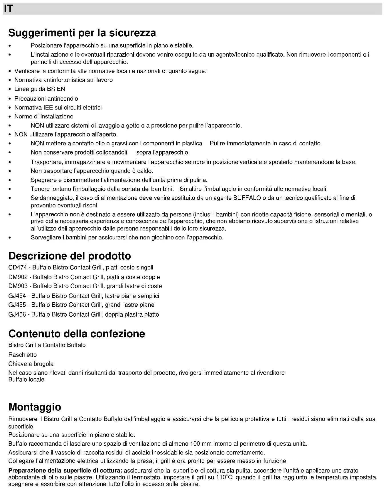 Montaggio Rimuovere il Bistro Grill a Contatto Buffalo dall’imballaggio e assicurarsi che la pellicola protettiva e tutti i residui siano eliminati dalla sua superficie. Posizionare su una superficie in piano e stabile. Buffalo raccomanda di lasciare uno spazio di ventilazione di almeno 100 mm intorno al perimetro di questa unità. Assicurarsi che il vassoio di raccolta residui di acciaio inossidabile sia posizionato correttamente. Collegare l’alimentazione elettrica utilizzando la presa; il grill è ora pronto per essere messo in funzione. Preparazione della superficie di cottura: assicurarsi che la superficie di cottura sia pulita, accendere l’unità e applicare uno strato abbondante di olio sulle piastre. Utilizzando il termostato, impostare il grill su 110˚C; quando il grill ha raggiunto le temperatura impostata, spegnere e assorbire con attenzione tutto l’olio in eccesso sulle piastre.IT Funzionamento Il Grill a Contatto deve essere acceso almeno 5 minuti prima dell’uso Per fare in modo che questa unità funzioni sempre in modo efficiente anche se viene utilizzato in maniera discontinua, si raccomanda di lasciare chiuse le piastre del grill e di azzerare il termostato quando l’apparecchio non viene utilizzato. In questo modo il consumo di potenza di energia viene ridotto e si consente un riscaldamento più rapido quando necessario. Buffalo consiglia di ingrassare leggermente la superficie di cottura prima di ogni utilizzo. Un’impostazione della temperatura tra i 200°C e i 220°C è generalmente sufficiente per la cottura dei cibi. La temperatura può variare per particolari tipi di cibi, esigenze individuali o esperienza personale. Collocare i cibi sulla superficie inferiore del grill, abbassare la superficie superiore e cuocere quanto necessario.