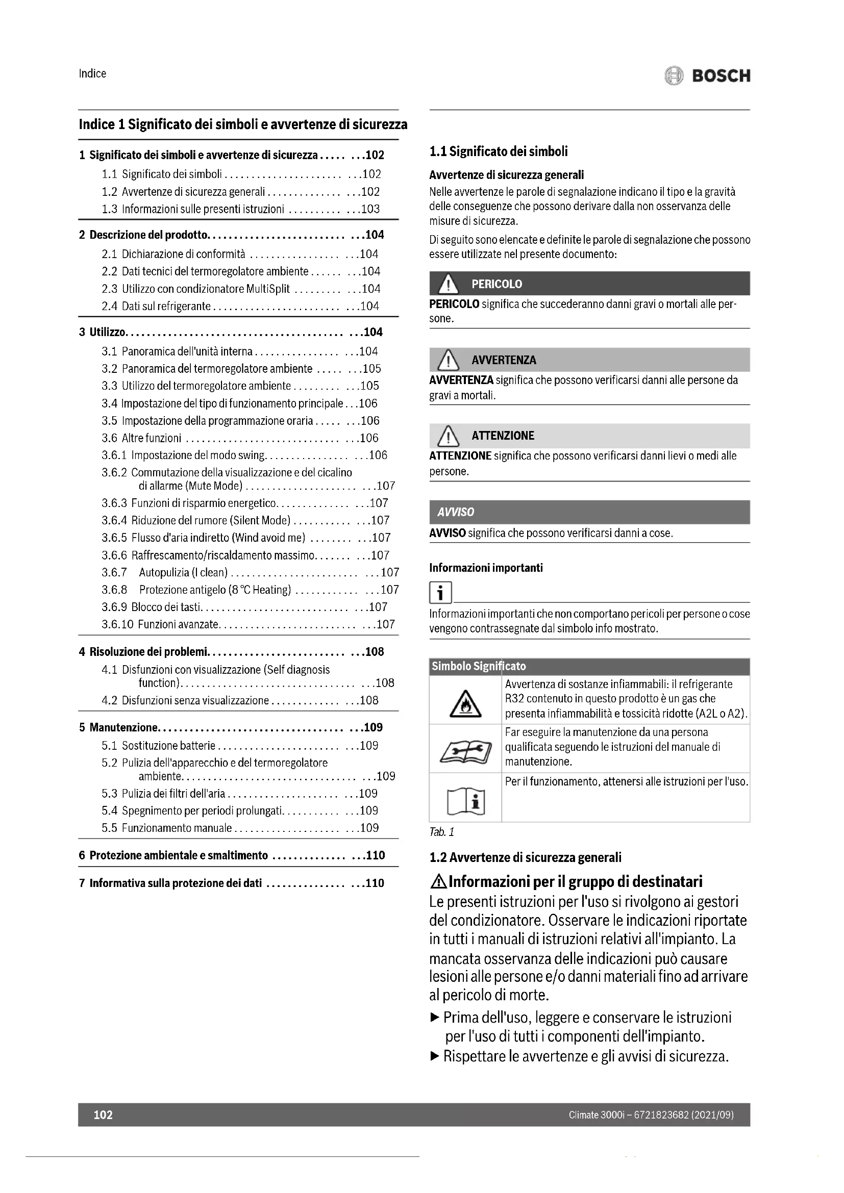 H Informazioni per il gruppo di destinatari Le presenti istruzioni per l'uso si rivolgono ai gestori del condizionatore. Osservare le indicazioni riportate in tutti i manuali di istruzioni relativi all'impianto. La mancata osservanza delle indicazioni può causare lesioni alle persone e/o danni materiali fino ad arrivare al pericolo di morte. ▶ Prima dell'uso, leggere e conservare le istruzioni per l'uso di tutti i componenti dell'impianto. ▶ Rispettare le avvertenze e gli avvisi di sicurezza. 1 Significato dei simboli e avvertenze di sicurezza . . . . . . . .102
