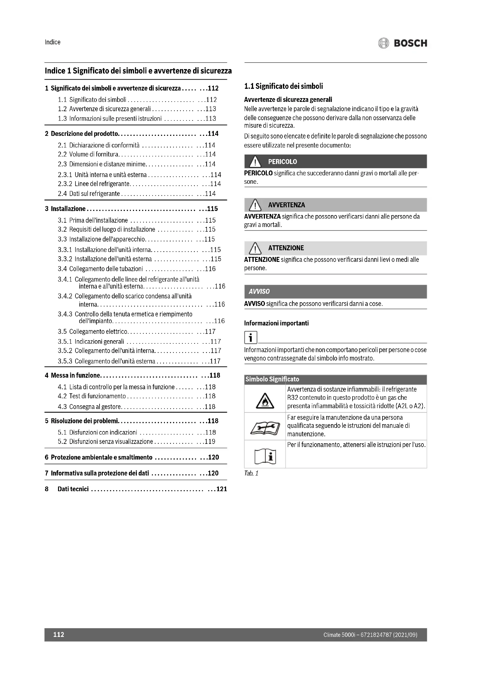 6 Protezione ambientale e smaltimento . . . . . . . . . . . . . . . . .120 7 Informativa sulla protezione dei dati . . . . . . . . . . . . . . . . . .120 8 Dati tecnici . . . . . . . . . . . . . . . . . . . . . . . . . . . . . . . . . . . . . . . .121 Simbolo Significato Avvertenza di sostanze infiammabili: il refrigerante R32 contenuto in questo prodotto è un gas che presenta infiammabilità e tossicità ridotte (A2L o A2). Far eseguire la manutenzione da una persona qualificata seguendo le istruzioni del manuale di manutenzione. Per il funzionamento, attenersi alle istruzioni per l'uso.Significato dei simboli e avvertenze di sicurezza