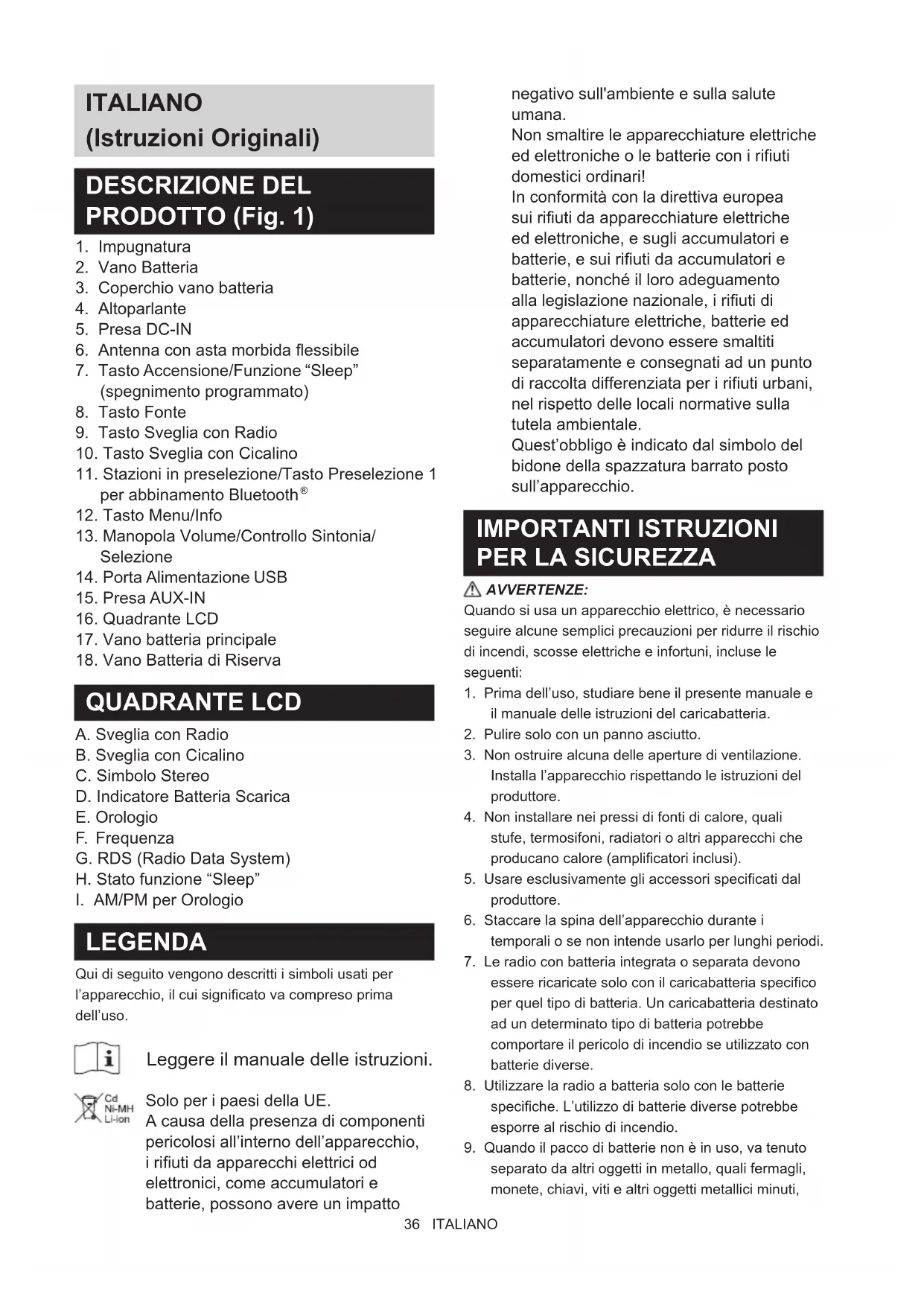 LEGENDA Qui di seguito vengono descritti i simboli usati per l’apparecchio, il cui signicato va compreso prima dell’uso. Leggere il manuale delle istruzioni. Solo per i paesi della UE. A causa della presenza di componenti pericolosi all’interno dell’apparecchio, i riuti da apparecchi elettrici od elettronici, come accumulatori e batterie, possono avere un impatto negativo sull'ambiente e sulla salute umana. Non smaltire le apparecchiature elettriche ed elettroniche o le batterie con i riuti domestici ordinari! In conformità con la direttiva europea sui riuti da apparecchiature elettriche ed elettroniche, e sugli accumulatori e batterie, e sui riuti da accumulatori e batterie, nonché il loro adeguamento alla legislazione nazionale, i riuti di apparecchiature elettriche, batterie ed accumulatori devono essere smaltiti separatamente e consegnati ad un punto di raccolta differenziata per i riuti urbani, nel rispetto delle locali normative sulla tutela ambientale. Quest’obbligo è indicato dal simbolo del bidone della spazzatura barrato posto sull’apparecchio. IMPORTANTI ISTRUZIONI