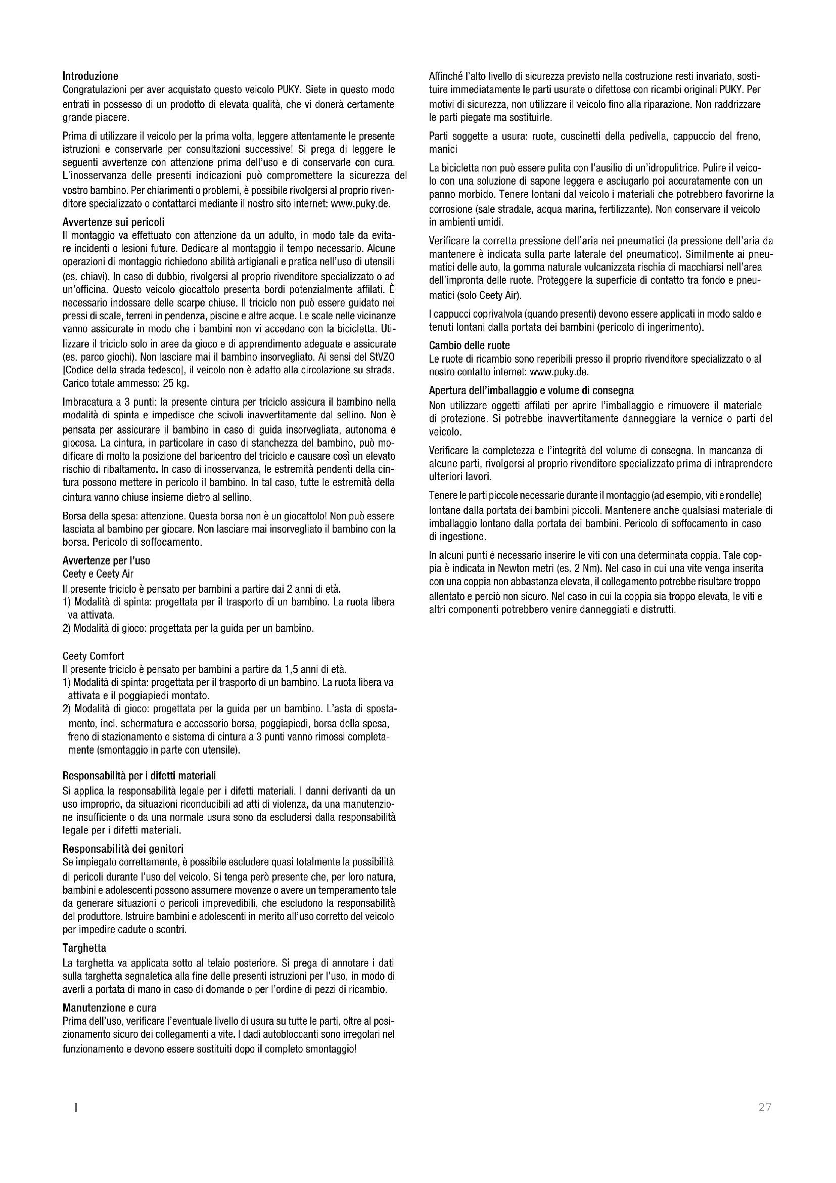 Introduzione Congratulazioni per aver acquistato questo veicolo PUKY. Siete in questo modo entrati in possesso di un prodotto di elevata qualità, che vi donerà certamente grande piacere. Prima di utilizzare il veicolo per la prima volta, leggere attentamente le presente istruzioni e conservarle per consultazioni successive! Si prega di leggere le seguenti avvertenze con attenzione prima dell’uso e di conservarle con cura. L’inosservanza delle presenti indicazioni può compromettere la sicurezza del vostro bambino. Per chiarimenti o problemi, è possibile rivolgersi al proprio riven- ditore specializzato o contattarci mediante il nostro sito internet: www.puky.de. Avvertenze sui pericoli Il montaggio va eettuato con attenzione da un adulto, in modo tale da evita- re incidenti o lesioni future. Dedicare al montaggio il tempo necessario. Alcune operazioni di montaggio richiedono abilità artigianali e pratica nell’uso di utensili (es. chiavi). In caso di dubbio, rivolgersi al proprio rivenditore specializzato o ad un’ocina. Questo veicolo giocattolo presenta bordi potenzialmente alati. È necessario indossare delle scarpe chiuse. Il triciclo non può essere guidato nei pressi di scale, terreni in pendenza, piscine e altre acque. Le scale nelle vicinanze vanno assicurate in modo che i bambini non vi accedano con la bicicletta. Uti- lizzare il triciclo solo in aree da gioco e di apprendimento adeguate e assicurate (es. parco giochi). Non lasciare mai il bambino insorvegliato. Ai sensi del StVZO [Codice della strada tedesco], il veicolo non è adatto alla circolazione su strada. Carico totale ammesso: 25 kg. Imbracatura a 3 punti: la presente cintura per triciclo assicura il bambino nella modalità di spinta e impedisce che scivoli inavvertitamente dal sellino. Non è pensata per assicurare il bambino in caso di guida insorvegliata, autonoma e giocosa. La cintura, in particolare in caso di stanchezza del bambino, può mo- dificare di molto la posizione del baricentro del triciclo e causare così un elevato rischio di ribaltamento. In caso di inosservanza, le estremità pendenti della cin- tura possono mettere in pericolo il bambino. In tal caso, tutte le estremità della cintura vanno chiuse insieme dietro al sellino. Borsa della spesa: attenzione. Questa borsa non è un giocattolo! Non può essere lasciata al bambino per giocare. Non lasciare mai insorvegliato il bambino con la borsa. Pericolo di soocamento. Avvertenze per l’uso Ceety e Ceety Air Il presente triciclo è pensato per bambini a partire dai 2 anni di età.