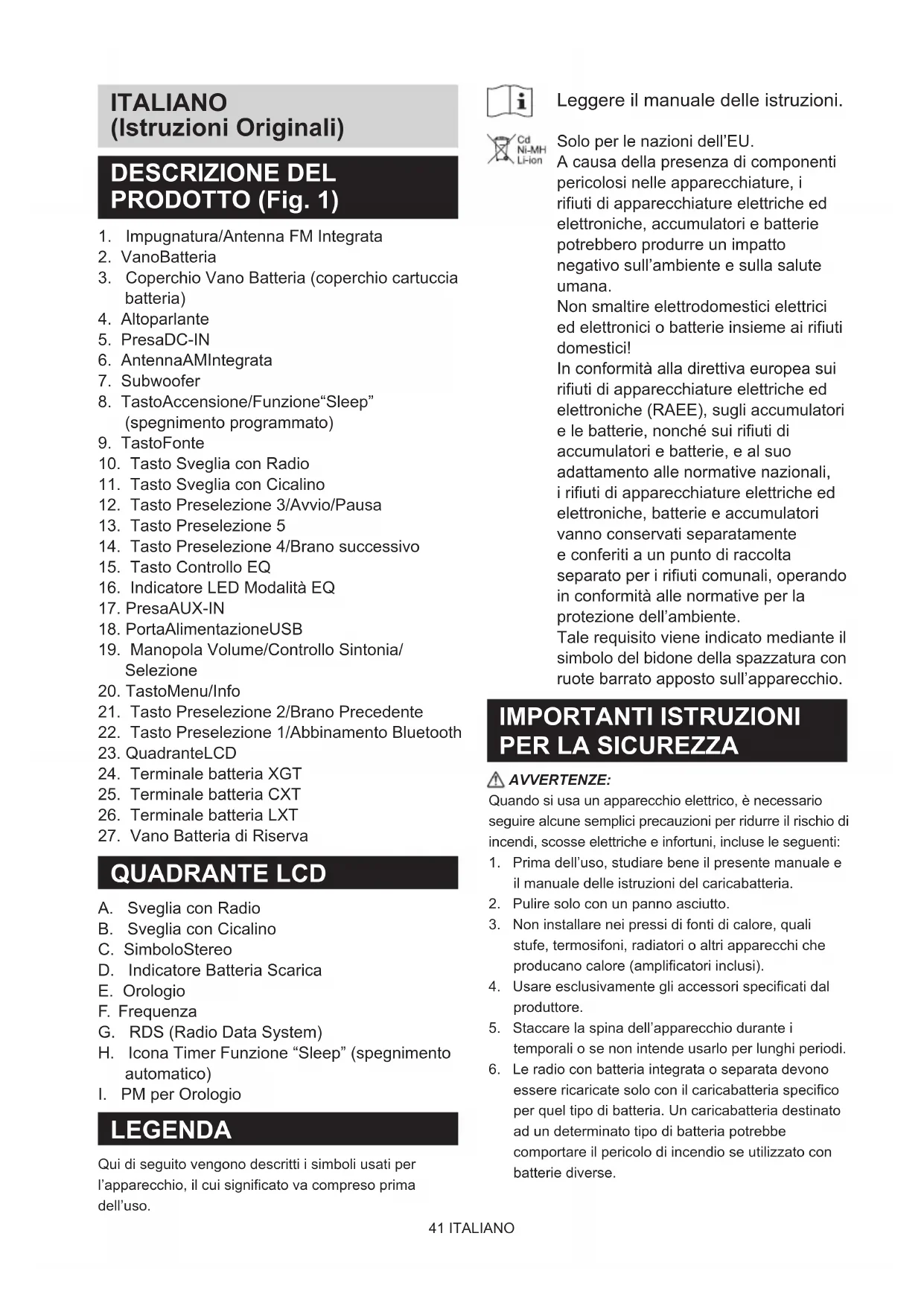 LEGENDA Qui di seguito vengono descritti i simboli usati per l’apparecchio, il cui significato va compreso prima dell’uso. Leggere il manuale delle istruzioni. Solo per le nazioni dell’EU. A causa della presenza di componenti pericolosi nelle apparecchiature, i rifiuti di apparecchiature elettriche ed elettroniche, accumulatori e batterie potrebbero produrre un impatto negativo sull’ambiente e sulla salute umana. Non smaltire elettrodomestici elettrici ed elettronici o batterie insieme ai rifiuti domestici! In conformità alla direttiva europea sui rifiuti di apparecchiature elettriche ed elettroniche (RAEE), sugli accumulatori e le batterie, nonché sui rifiuti di accumulatori e batterie, e al suo adattamento alle normative nazionali, i rifiuti di apparecchiature elettriche ed elettroniche, batterie e accumulatori vanno conservati separatamente e conferiti a un punto di raccolta separato per i rifiuti comunali, operando in conformità alle normative per la protezione dell’ambiente. Tale requisito viene indicato mediante il simbolo del bidone della spazzatura con ruote barrato apposto sull’apparecchio. IMPORTANTI ISTRUZIONI