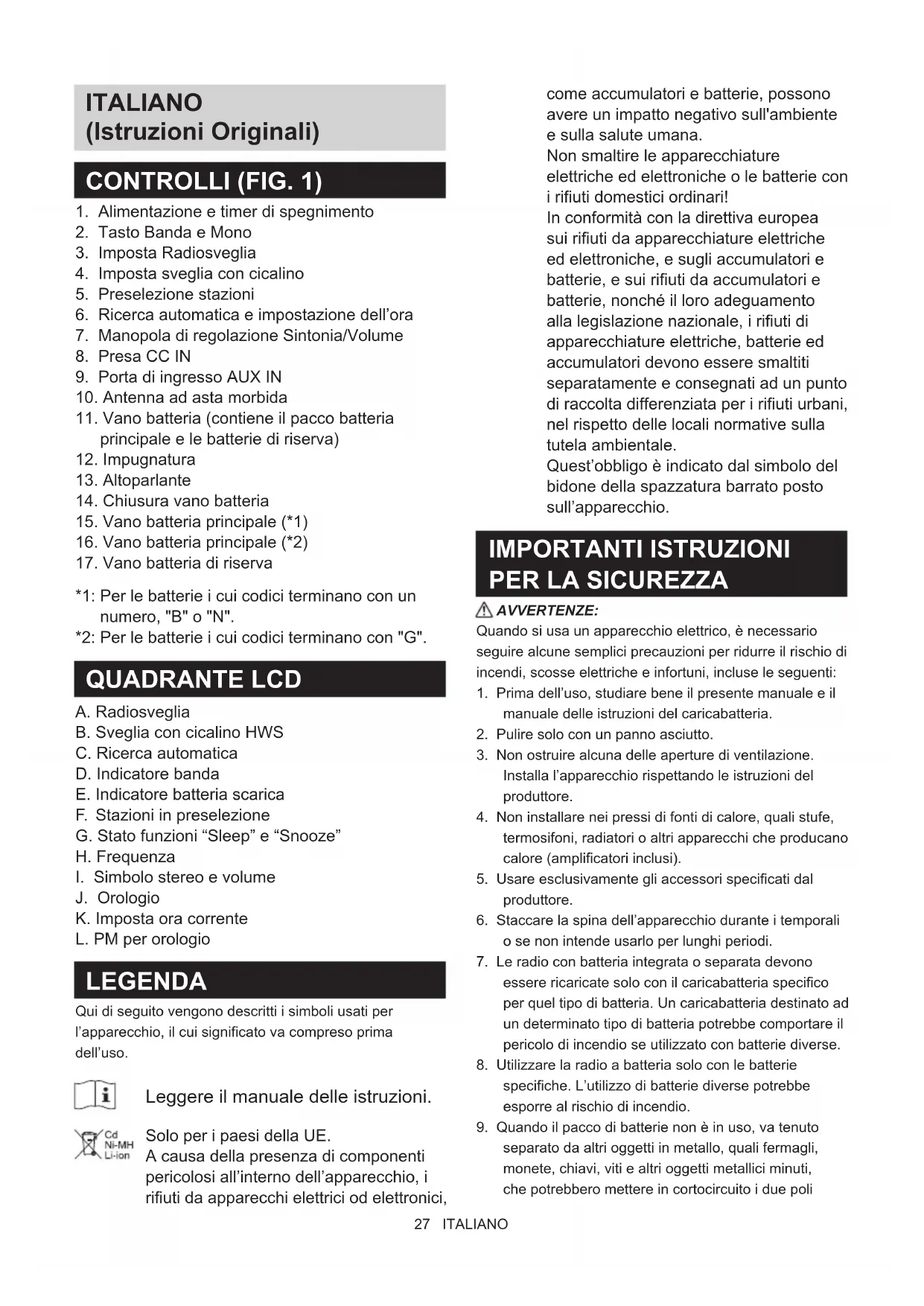 J. Orologio K. Imposta ora corrente L. PM per orologio LEGENDA Qui di seguito vengono descritti i simboli usati per l’apparecchio, il cui significato va compreso prima dell’uso. Leggere il manuale delle istruzioni. Solo per i paesi della UE. A causa della presenza di componenti pericolosi all’interno dell’apparecchio, i rifiuti da apparecchi elettrici od elettronici, come accumulatori e batterie, possono avere un impatto negativo sull'ambiente e sulla salute umana. Non smaltire le apparecchiature elettriche ed elettroniche o le batterie con i rifiuti domestici ordinari! In conformità con la direttiva europea sui rifiuti da apparecchiature elettriche ed elettroniche, e sugli accumulatori e batterie, e sui rifiuti da accumulatori e batterie, nonché il loro adeguamento alla legislazione nazionale, i rifiuti di apparecchiature elettriche, batterie ed accumulatori devono essere smaltiti separatamente e consegnati ad un punto di raccolta differenziata per i rifiuti urbani, nel rispetto delle locali normative sulla tutela ambientale. Quest’obbligo è indicato dal simbolo del bidone della spazzatura barrato posto sull’apparecchio. IMPORTANTI ISTRUZIONI