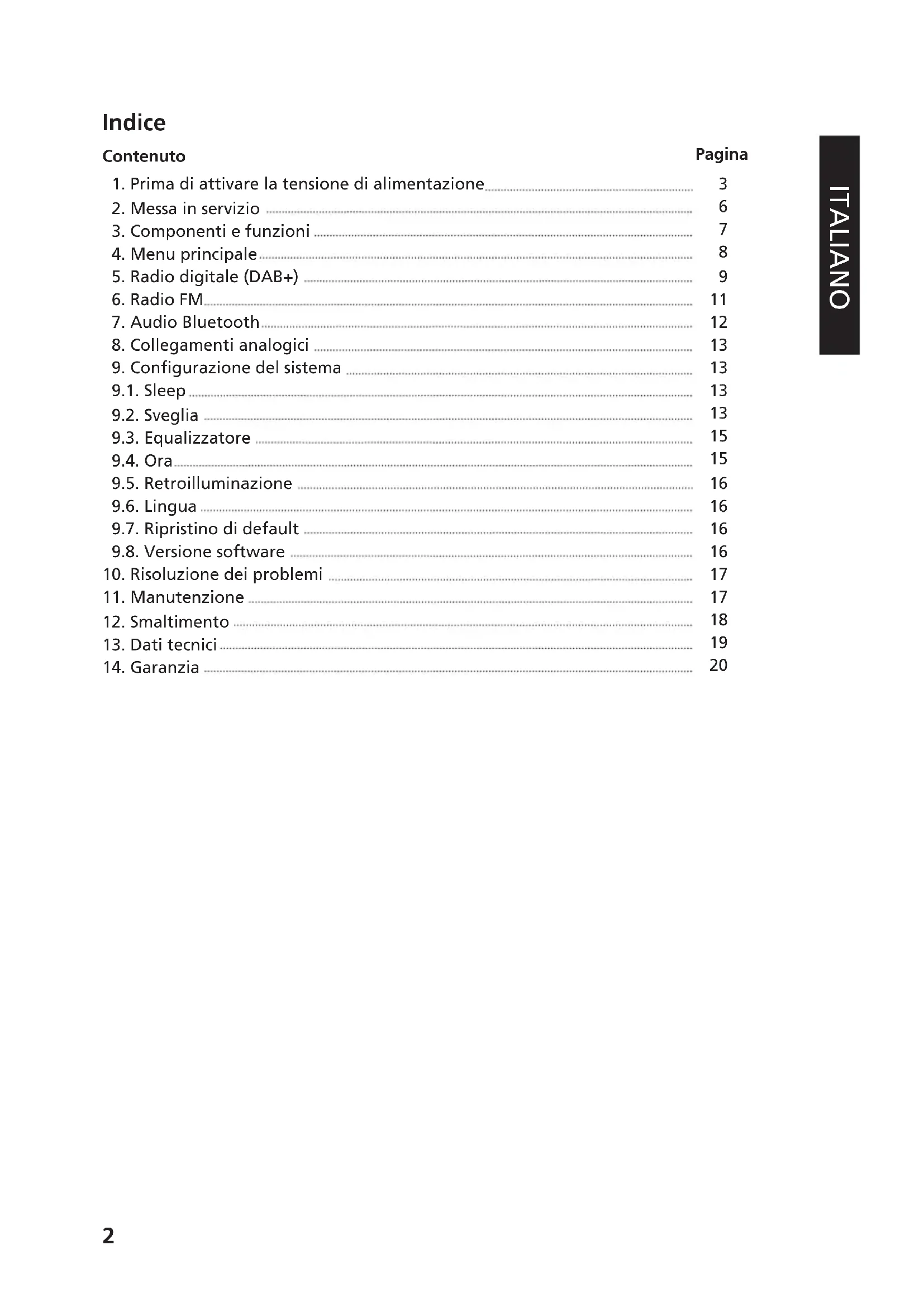 Stand-by On/Off; sveglia off Impostazione funzione snooze Aprire/chiudere selezione della sorgente Aprire/chiudere il menu Impostazione sveglia Dimmer a 3 livelli Avvia riproduzione, pausa Seleziona titolo Accoppiamento Bluetooth; disconnessione Alta; FM: Impostare frequenza Bassa; FM: Impostare frequenza Sinistra; indietro Destra; avanti Confermare immissione; FM Avviare ricerca; Immagine radio, presentazione a schermo intero Selezionare la preimpostazione dell'equalizzatore Silenziatore; disattivare silenziatore (Muto) Volume più / meno7