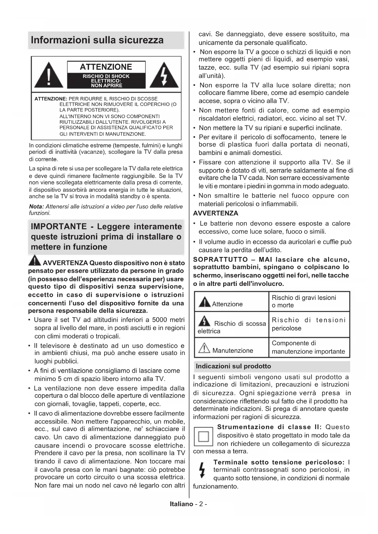 - Informazioni sullo smaltimento Italiano - 2 - Informazioni sulla sicurezza ATTENZIONE RISCHIO DI SHOCK ELETTRICO:NON APRIREATTENZIONE: PER RIDURRE IL RISCHIO DI SCOSSE ELETTRICHE NON RIMUOVERE IL COPERCHIO (O LA PARTE POSTERIORE). ALL'INTERNO NON VI SONO COMPONENTI RIUTILIZZABILI DALL'UTENTE. RIVOLGERSI A PERSONALE DI ASSISTENZA QUALIFICATO PER GLI INTERVENTI DI MANUTENZIONE.Nota: Attenersi alle istruzioni a video per l'uso delle relative funzioni.In condizioni climatiche estreme (tempeste, fulmini) e lunghi periodi di inattività (vacanze), scollegare la TV dalla presa di corrente.La spina di rete si usa per scollegare la TV dalla rete elettrica e deve quindi rimanere facilmente raggiungibile. Se la TV non viene scollegata elettricamente dalla presa di corrente, il dispositivo assorbirà ancora energia in tutte le situazioni, anche se la TV si trova in modalità standby o è spenta. IMPORTANTE - Leggere interamente queste istruzioni prima di installare o mettere in funzione AVVERTENZA Questo dispositivo non è stato pensato per essere utilizzato da persone in grado (in possesso dell’esperienza necessaria per) usare questo tipo di dispositivi senza supervisione, eccetto in caso di supervisione o istruzioni concernenti l’uso del dispositivo fornite da una persona responsabile della sicurezza. Usare il set TV ad altitudini inferiori a 5000 metri sopra al livello del mare, in posti asciutti e in regioni con climi moderati o tropicali. Il televisore è destinato ad un uso domestico e in ambienti chiusi, ma può anche essere usato in luoghi pubblici. p. 36