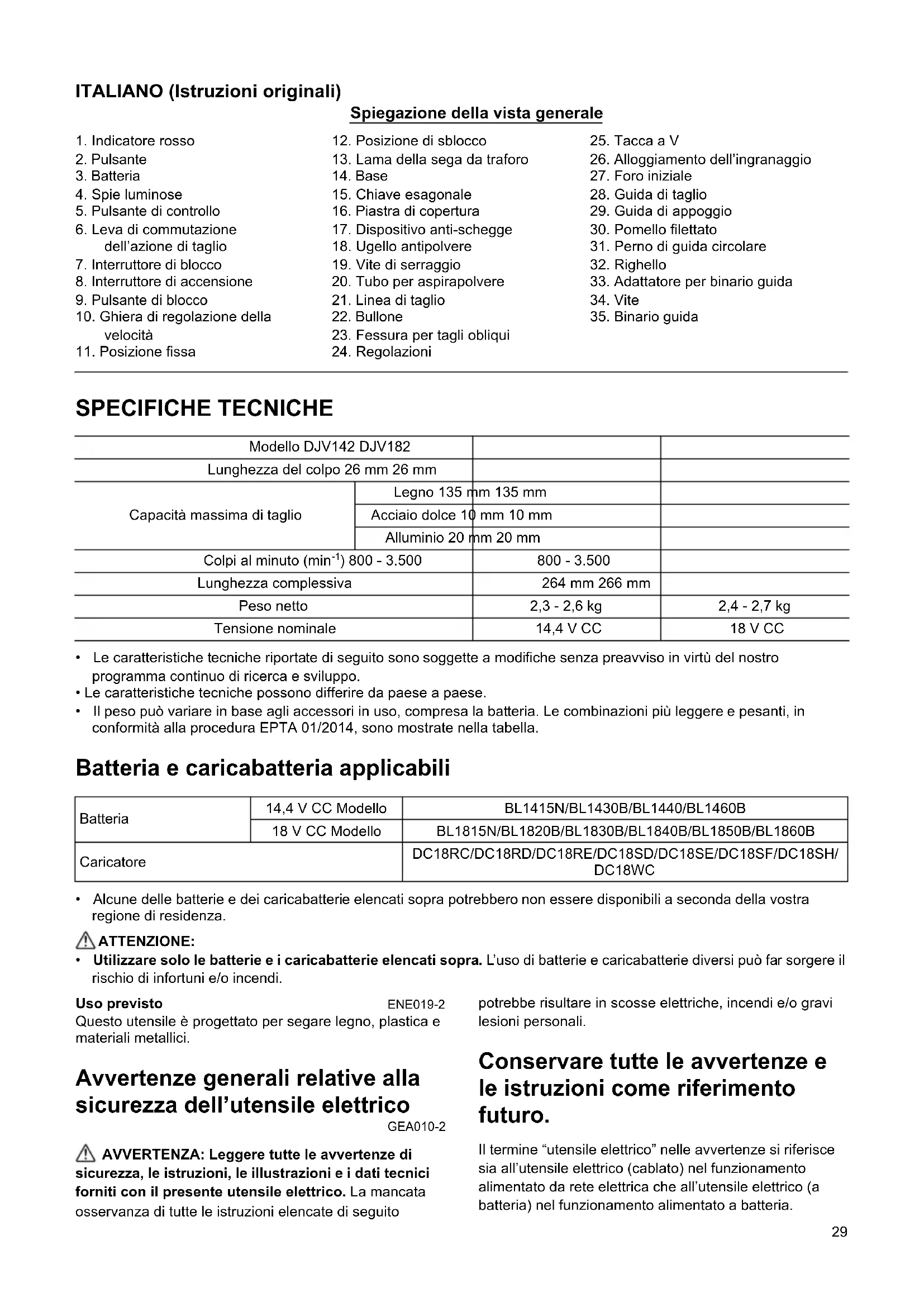 - Utilizzare solo le batterie e i caricabatterie elencati sopra. L’uso di batterie e caricabatterie diversi può far sorgere il rischio di infortuni e/o incendi. Uso previsto ENE019-2 Questo utensile è progettato per segare legno, plastica e materiali metallici. Avvertenze generali relative alla sicurezza dell’utensile elettrico GEA010-2 AVVERTENZA: Leggere tutte le avvertenze di sicurezza, le istruzioni, le illustrazioni e i dati tecnici forniti con il presente utensile elettrico. La mancata osservanza di tutte le istruzioni elencate di seguito potrebbe risultare in scosse elettriche, incendi e/o gravi lesioni personali. Conservare tutte le avvertenze e le istruzioni come riferimento futuro. Il termine “utensile elettrico” nelle avvertenze si riferisce sia all’utensile elettrico (cablato) nel funzionamento alimentato da rete elettrica che all’utensile elettrico (a batteria) nel funzionamento alimentato a batteria.