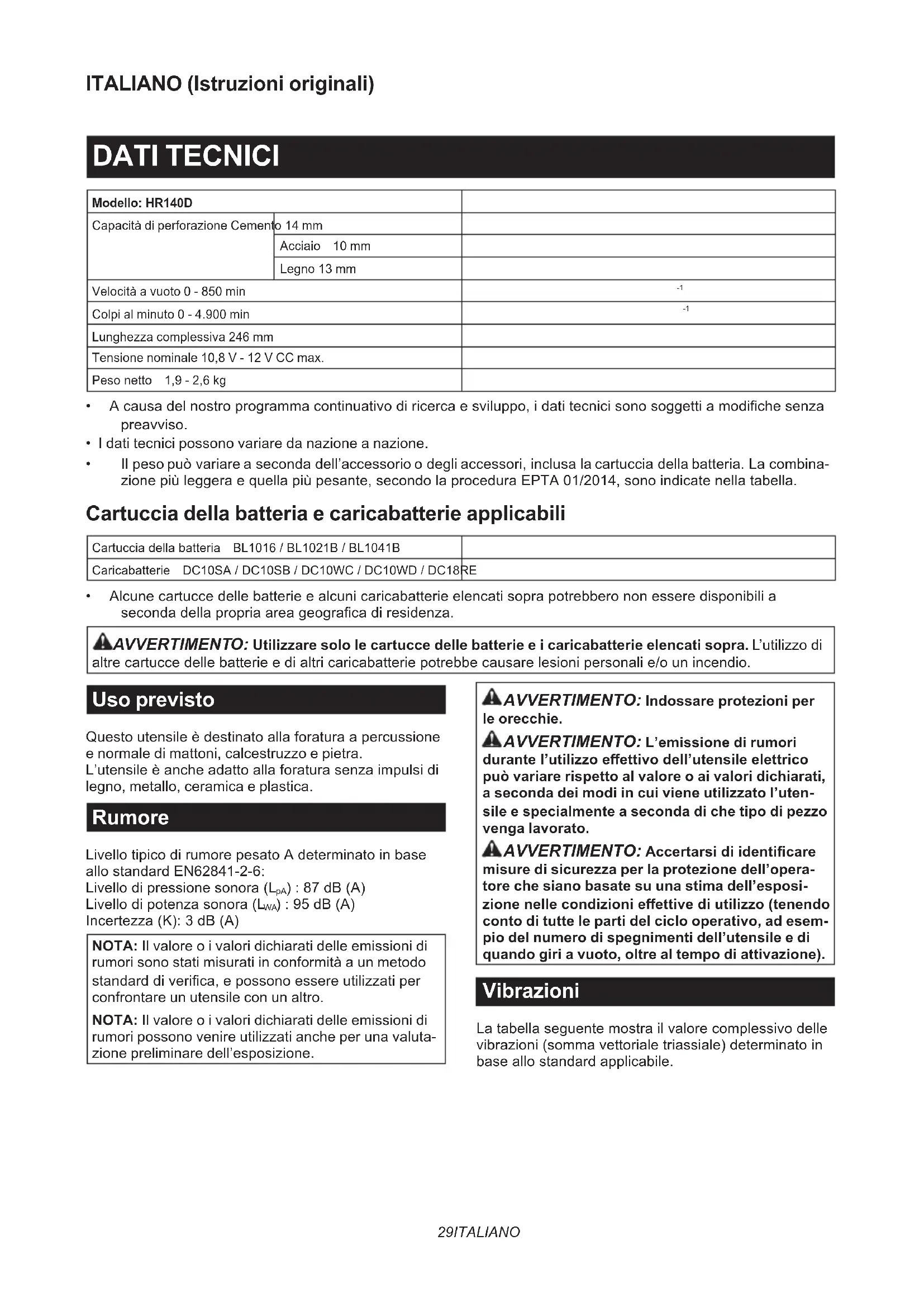 - Alcunecartuccedellebatterieealcunicaricabatterieelencatisoprapotrebberononesseredisponibilia secondadellapropriaareageogracadiresidenza. AVVERTIMENTO: Utilizzare solo le cartucce delle batterie e i caricabatterie elencati sopra. L’utilizzo di altrecartuccedellebatterieedialtricaricabatteriepotrebbecausarelesionipersonalie/ounincendio. Uso previsto Questoutensileèdestinatoallaforaturaapercussione e normale di mattoni, calcestruzzo e pietra. L’utensileèancheadattoallaforaturasenzaimpulsidi legno, metallo, ceramica e plastica. Rumore LivellotipicodirumorepesatoAdeterminatoinbase allostandardEN62841-2-6: Livellodipressionesonora(L