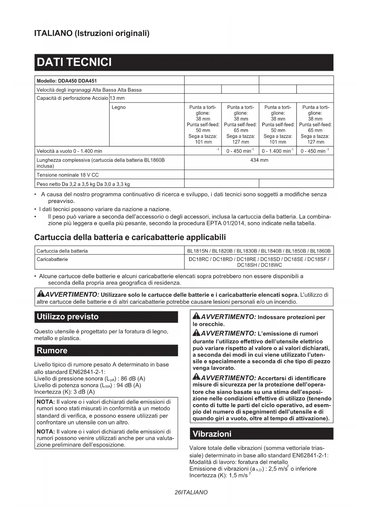 - Alcune cartucce delle batterie e alcuni caricabatterie elencati sopra potrebbero non essere disponibili a secondadellapropriaareageogracadiresidenza. AVVERTIMENTO: Utilizzare solo le cartucce delle batterie e i caricabatterie elencati sopra. L’utilizzo di altre cartucce delle batterie e di altri caricabatterie potrebbe causare lesioni personali e/o un incendio. Utilizzo previsto Questo utensile è progettato per la foratura di legno, metallo e plastica. Rumore Livello tipico di rumore pesato A determinato in base allo standard EN62841-2-1: Livello di pressione sonora (L