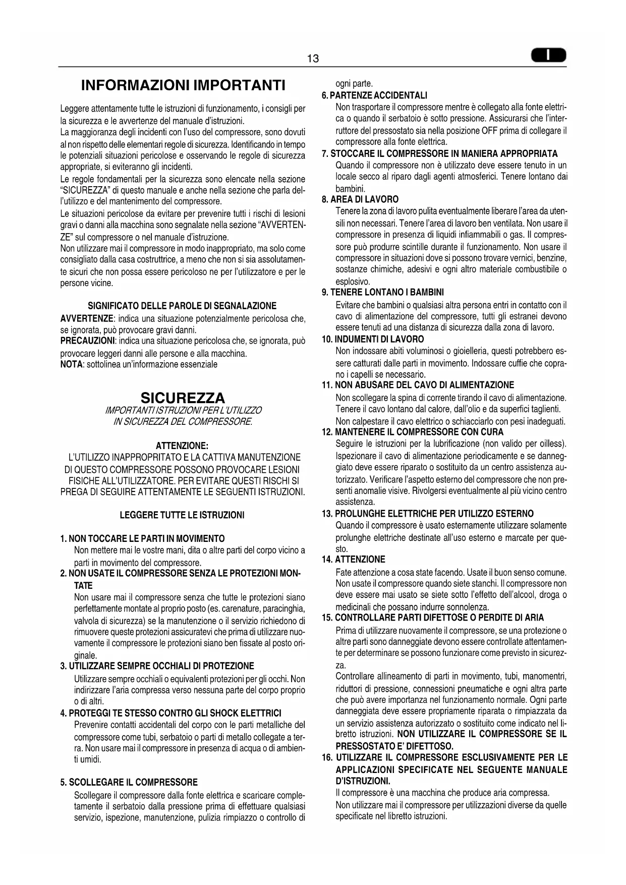 INFORMAZIONI IMPORTANTI Leggere attentamente tutte le istruzioni di funzionamento, i consigli per la sicurezza e le avvertenze del manuale d’istruzioni. La maggioranza degli incidenti con l’uso del compressore, sono dovuti al non rispetto delle elementari regole di sicurezza. Identificando in tempo le potenziali situazioni pericolose e osservando le regole di sicurezza appropriate, si eviteranno gli incidenti. Le regole fondamentali per la sicurezza sono elencate nella sezione “SICUREZZA” di questo manuale e anche nella sezione che parla del- l’utilizzo e del mantenimento del compressore. Le situazioni pericolose da evitare per prevenire tutti i rischi di lesioni gravi o danni alla macchina sono segnalate nella sezione “AVVERTEN- ZE” sul compressore o nel manuale d’istruzione. Non utilizzare mai il compressore in modo inappropriato, ma solo come consigliato dalla casa costruttrice, a meno che non si sia assolutamen- te sicuri che non possa essere pericoloso ne per l’utilizzatore e per le persone vicine.