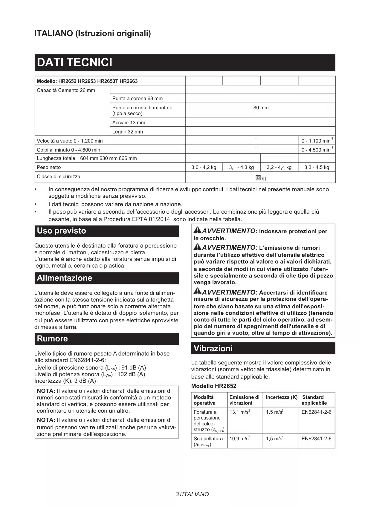 Modello HR2653 Modalità operativaEmissione di vibrazioniIncertezza (K) Standard applicabileForatura a percussione del calce-struzzo(ah, HD 11,2 m/s 1,5 m/s EN62841-2-6Scalpellatura h, CHeq 9,3 m/s 1,5 m/s EN62841-2-6 Modello HR2653T Modalità operativaEmissione di vibrazioniIncertezza (K) Standard applicabileForatura a percussione del calce-struzzo(ah, HD 10,9 m/s 1,5 m/s EN62841-2-6Scalpellatura h, CHeq 9,6 m/s 1,5 m/s EN62841-2-6 Modello HR2663 Modalità operativaEmissione di vibrazioniIncertezza (K) Standard applicabileForatura a percussione del calce-struzzo(ah, HD 9,3 m/s 1,5 m/s EN62841-2-6Scalpellatura h, CHeq 7,0 m/s 1,5 m/s EN62841-2-6 NOTA: Il valore o i valori complessivi delle vibra- zionidichiaratisonostatimisuratiinconformitàaun metodostandarddiverica,epossonoessereutiliz- zatiperconfrontareunutensileconunaltro. NOTA:Ilvaloreoivaloricomplessividellevibrazioni dichiaratipossonovenireutilizzatiancheperuna valutazionepreliminaredell’esposizione. AVVERTIMENTO: L’emissione delle vibra- zioni durante l’utilizzo eettivo dell’utensile elettrico può variare rispetto al valore o ai valori dichiarati, a seconda dei modi in cui viene utiliz- zato l’utensile, specialmente a seconda di che tipo di pezzo venga lavorato. AVVERTIMENTO: Accertarsi di identicare misure di sicurezza per la protezione dell’opera- tore che siano basate su una stima dell’esposi- zione nelle condizioni eettive di utilizzo (tenendo conto di tutte le parti del ciclo operativo, ad esem- pio del numero di spegnimenti dell’utensile e di quando giri a vuoto, oltre al tempo di attivazione). Dichiarazione di conformità CE Solo per i paesi europei LadichiarazionediconformitàCEèinclusanell’Alle- gatoAalpresentemanualediistruzioni. AVVERTENZE DI SICUREZZA Avvertenze generali relative alla sicurezza dell’utensile elettrico AVVERTIMENTO: Leggere tutte le avvertenze di sicurezza, le istruzioni, le illustrazioni e i dati tecnici forniti con il presente utensile elettrico. La mancataosservanzaditutteleistruzionielencatedi seguito potrebbe risultare in scosse elettriche, incendi e/o gravi lesioni personali. Conservare tutte le avvertenze e le istruzioni come riferimento futuro. Iltermine“utensileelettrico”nelleavvertenzesiriferisce siaall’utensileelettrico(cablato)nelfunzionamento alimentato da rete elettrica che all’utensile elettrico (a batteria)nelfunzionamentoalimentatoabatteria.