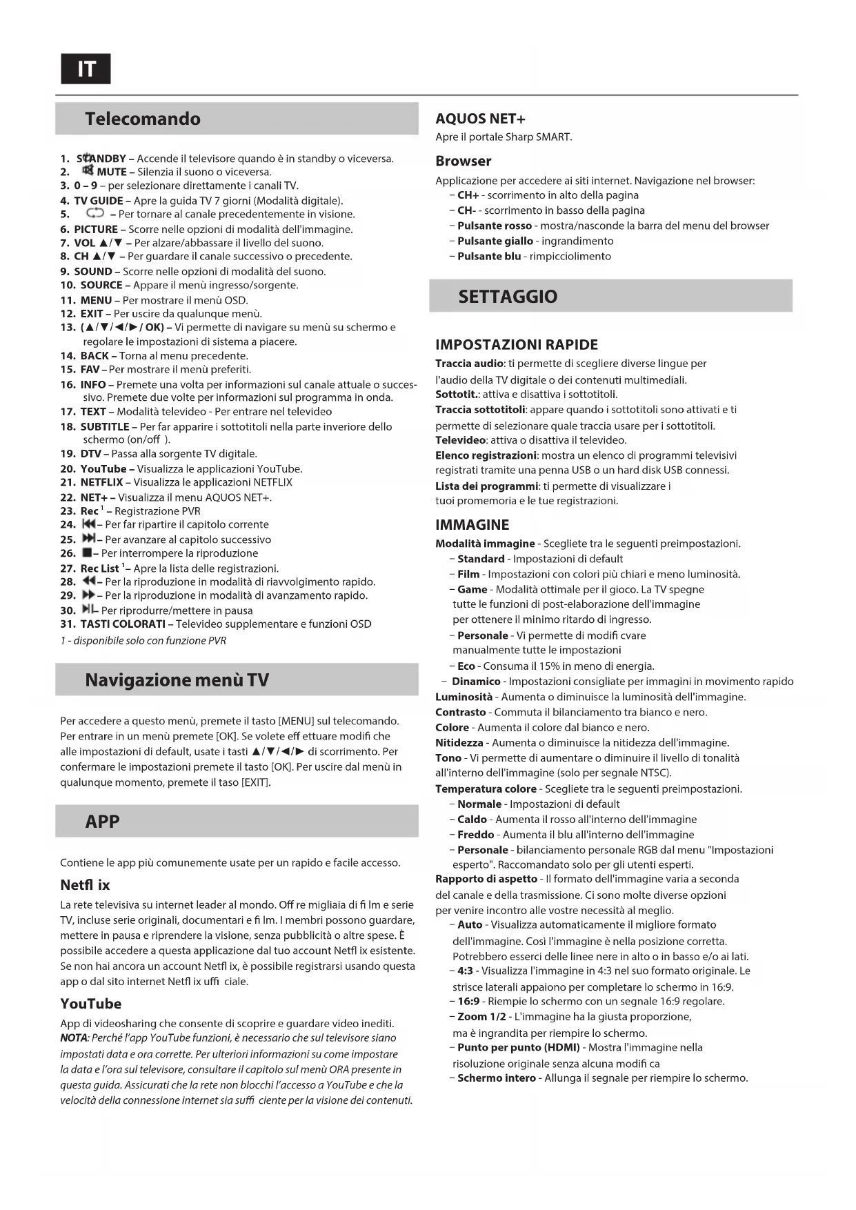 Navigazione menù TV Per accedere a questo menù, premete il tasto [MENU] sul telecomando. Per entrare in un menù premete [OK]. Se volete e ettuare modi che alle impostazioni di default, usate i tasti ▲/▼/◄/► di scorrimento. Per confermare le impostazioni premete il tasto [OK]. Per uscire dal menù in qualunque momento, premete il taso [EXIT]. APP Contiene le app più comunemente usate per un rapido e facile accesso. Net ix La rete televisiva su internet leader al mondo. O re migliaia di lm e serie TV, incluse serie originali, documentari e lm. I membri possono guardare, mettere in pausa e riprendere la visione, senza pubblicità o altre spese. È possibile accedere a questa applicazione dal tuo account Net ix esistente. Se non hai ancora un account Net ix, è possibile registrarsi usando questa app o dal sito internet Net ix u ciale. YouTube App di videosharing che consente di scoprire e guardare video inediti. NOTA: Perché l’app YouTube funzioni, è necessario che sul televisore siano impostati data e ora corrette. Per ulteriori informazioni su come impostare la data e l’ora sul televisore, consultare il capitolo sul menù ORA presente in questa guida. Assicurati che la rete non blocchi l’accesso a YouTube e che la velocità della connessione internet sia su ciente per la visione dei contenuti. AQUOS NET+ Apre il portale Sharp SMART. Browser Applicazione per accedere ai siti internet. Navigazione nel browser: CH+ - scorrimento in alto della pagina CH- - scorrimento in basso della pagina Pulsante rosso - mostra/nasconde la barra del menu del browser Pulsante giallo - ingrandimento Pulsante blu - rimpicciolimento SETTAGGIO IMPOSTAZIONI RAPIDE Traccia audio: ti permette di scegliere diverse lingue per l'audio della TV digitale o dei contenuti multimediali. Sottotit.: attiva e disattiva i sottotitoli. Traccia sottotitoli: appare quando i sottotitoli sono attivati e ti permette di selezionare quale traccia usare per i sottotitoli. Televideo: attiva o disattiva il televideo. Elenco registrazioni: mostra un elenco di programmi televisivi registrati tramite una penna USB o un hard disk USB connessi. Lista dei programmi: ti permette di visualizzare i tuoi promemoria e le tue registrazioni. IMMAGINE Modalità immagine - Scegliete tra le seguenti preimpostazioni. Standard - Impostazioni di default Film - Impostazioni con colori più chiari e meno luminosità. Game - Modalità ottimale per il gioco. La TV spegne tutte le funzioni di post-elaborazione dell'immagine per ottenere il minimo ritardo di ingresso. Personale - Vi permette di modi cvare manualmente tutte le impostazioni Eco - Consuma il 15% in meno di energia. Dinamico - Impostazioni consigliate per immagini in movimento rapido Luminosità - Aumenta o diminuisce la luminosità dell'immagine. Contrasto - Commuta il bilanciamento tra bianco e nero. Colore - Aumenta il colore dal bianco e nero. Nitidezza - Aumenta o diminuisce la nitidezza dell'immagine. Tono - Vi permette di aumentare o diminuire il livello di tonalità all'interno dell'immagine (solo per segnale NTSC). Temperatura colore - Scegliete tra le seguenti preimpostazioni. Normale - Impostazioni di default Caldo - Aumenta il rosso all'interno dell'immagine Freddo - Aumenta il blu all'interno dell'immagine Personale - bilanciamento personale RGB dal menu "Impostazioni esperto". Raccomandato solo per gli utenti esperti. Rapporto di aspetto - Il formato dell'immagine varia a seconda del canale e della trasmissione. Ci sono molte diverse opzioni per venire incontro alle vostre necessità al meglio. Auto - Visualizza automaticamente il migliore formato dell'immagine. Così l'immagine è nella posizione corretta. Potrebbero esserci delle linee nere in alto o in basso e/o ai lati. 4:3 - Visualizza l'immagine in 4:3 nel suo formato originale. Le strisce laterali appaiono per completare lo schermo in 16:9. 16:9 - Riempie lo schermo con un segnale 16:9 regolare. Zoom 1/2 - L'immagine ha la giusta proporzione, ma è ingrandita per riempire lo schermo. Punto per punto (HDMI) - Mostra l'immagine nella risoluzione originale senza alcuna modi ca Schermo intero - Allunga il segnale per riempire lo schermo.17 Impostazioni avanzate – Riduzione del disturbo - Filtra e riduce il rumore (interferenza) dell'immagine. – Gamma - regola le tonalità tra le parti chiare e scure dell'immagine. – Contrasto attivo - Ottimizza automaticamente la 'retroilluminazione' e il 'contrasto' dell'immagine sulla base della luminosità dello schermo. – Retroilluminazione - regola la luminosità dello schermo aumentando/diminuendo la retroilluminazione del pannello. – Rosso - regola la tonalità di rosso dell'immagine. – Verde - regola la tonalità di verde dell'immagine. – Blu - regola la tonalità di blu dell'immagine. – CMS Hue - È uno standard per regolare il colore in una tonalità tendente maggiormente al rosso o al blu. – Valore CMS - Un valore più elevato rende le immagini più luminose. Un valore minore rende le immagini più scure. – Saturazione CMS - Aumenta o riduce la saturazione di un colore selezionato. AUDIO Modalità audio - Scegliete tra le seguenti preimpostazioni – Standard - Impostazioni di default – Musica - Enfatizza la musica al di sopra delle voci – Film - Dà un audio live e ricco ai lm – Sport - Enfatizza l'audio per lo sport – Personale - Seleziona le vostre impostazioni audio personali DTS Studio Sound - Vi permette di accendere e spegnere l'e etto audio surround. DTS DRC: regola il livello della gamma dinamica per le colonne sonore dei lm in DTS. I suoni molto alti vengono abbassati e il volume delle parti con suoni più bassi viene incrementato. L'impostazione è consigliata per l'ascolto notturno. Altoparlante: ulteriori impostazioni per gli altoparlanti del televisore o per quelli esterni. – Uscita digitale: impostazioni per l'uscita audio digitale. Scegli tra le seguenti opzioni: – Auto: seleziona automaticamente le impostazioni migliori.