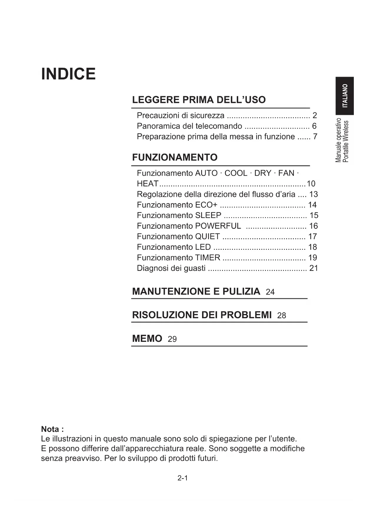 unit. – Switch off unit and call dealer. If the fault persists, please call your local dealer / serviceman.Manuale operativo Portatile Wireless ITALIANO 2-1 Nota : Le illustrazioni in questo manuale sono solo di spiegazione per l’utente. E possono differire dall’apparecchiatura reale. Sono soggette a modifiche senza preavviso. Per lo sviluppo di prodotti futuri. INDICE