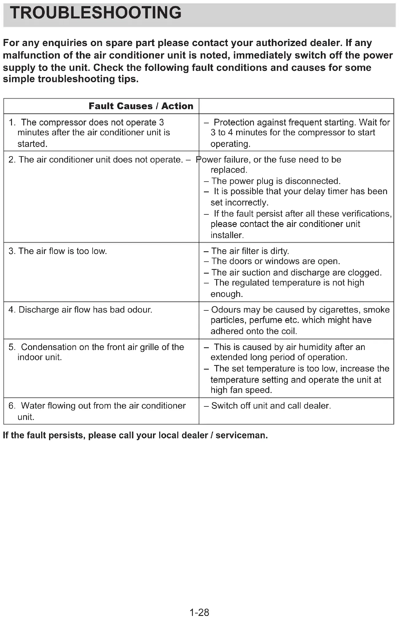 Per qualsiasi richiesta di informazioni su pezzi di ricambio contattare il proprio rivenditore autorizzato. Se si nota malfunzionamento del condizionatore, spegnere immediatamente l’alimentazione all’unità. Verificare le seguenti condizioni di guasto e le cause con alcuni semplici suggerimenti per la risoluzione. Guasto Cause / azione