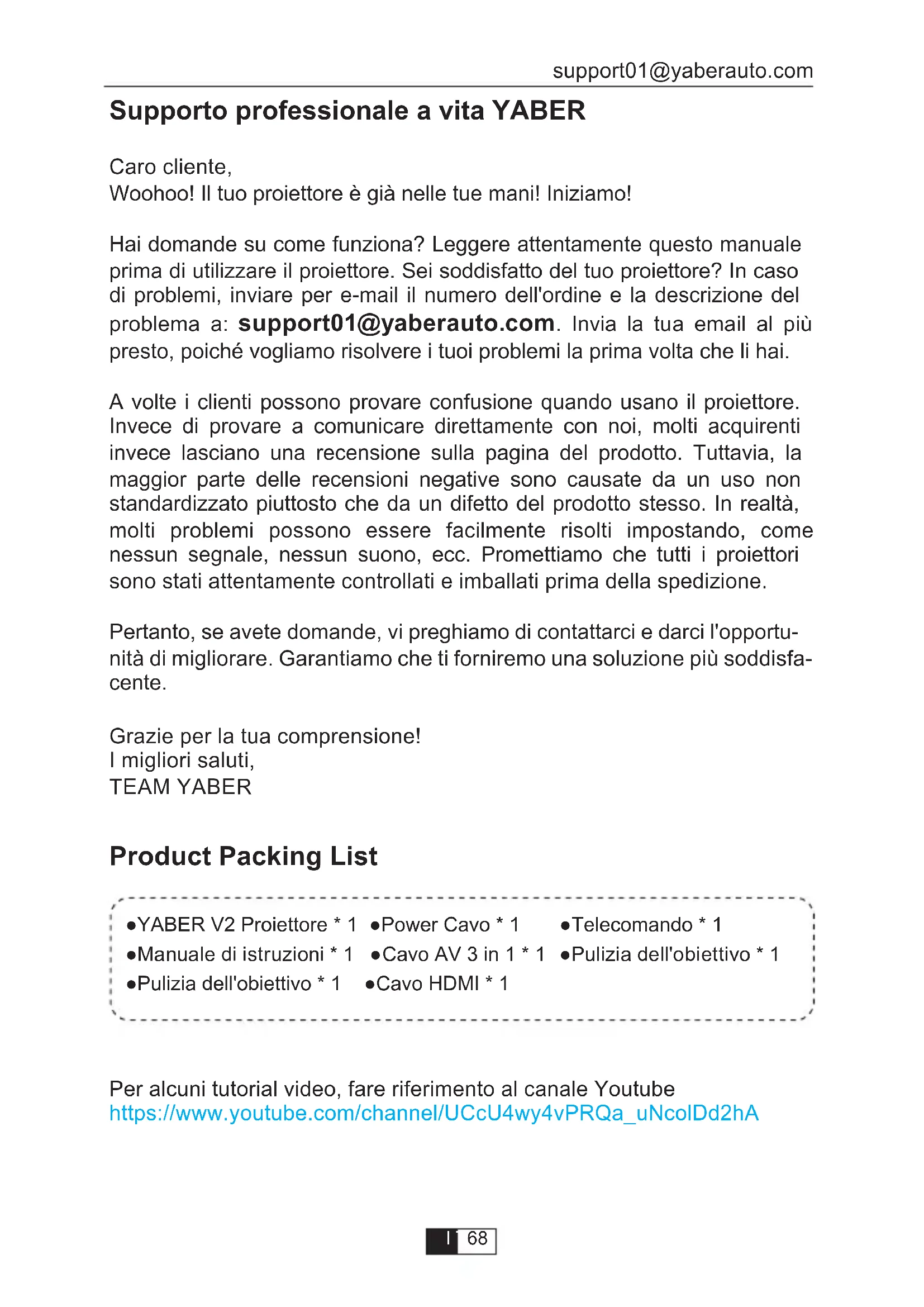113 114 115 116 117 118 119 120 121 122 123 124 125 126 127 128 129 130 131 132 133 134support01@yaberauto.com Supporto professionale a vita YABER Product Packing List Caro cliente, Woohoo! Il tuo proiettore è già nelle tue mani! Iniziamo! Hai domande su come funziona? Leggere attentamente questo manuale prima di utilizzare il proiettore. Sei soddisfatto del tuo proiettore? In caso di problemi, inviare per e-mail il numero dell'ordine e la descrizione del problema a: support01@yaberauto.com. Invia la tua email al più presto, poiché vogliamo risolvere i tuoi problemi la prima volta che li hai. A volte i clienti possono provare confusione quando usano il proiettore. Invece di provare a comunicare direttamente con noi, molti acquirenti invece lasciano una recensione sulla pagina del prodotto. Tuttavia, la maggior parte delle recensioni negative sono causate da un uso non standardizzato piuttosto che da un difetto del prodotto stesso. In realtà, molti problemi possono essere facilmente risolti impostando, come nessun segnale, nessun suono, ecc. Promettiamo che tutti i proiettori sono stati attentamente controllati e imballati prima della spedizione. Pertanto, se avete domande, vi preghiamo di contattarci e darci l'opportu- nità di migliorare. Garantiamo che ti forniremo una soluzione più soddisfa- cente. Grazie per la tua comprensione! I migliori saluti, TEAM YABER ●YABER V2 Proiettore * 1 ●Power Cavo * 1 ●Telecomando * 1 ●Manuale di istruzioni * 1 ●Cavo AV 3 in 1 * 1 ●Pulizia dell'obiettivo * 1 ●Pulizia dell'obiettivo * 1 ●Cavo HDMI * 1 Per alcuni tutorial video, fare riferimento al canale Youtube https://www.youtube.com/channel/UCcU4wy4vPRQa_uNcolDd2hA I T