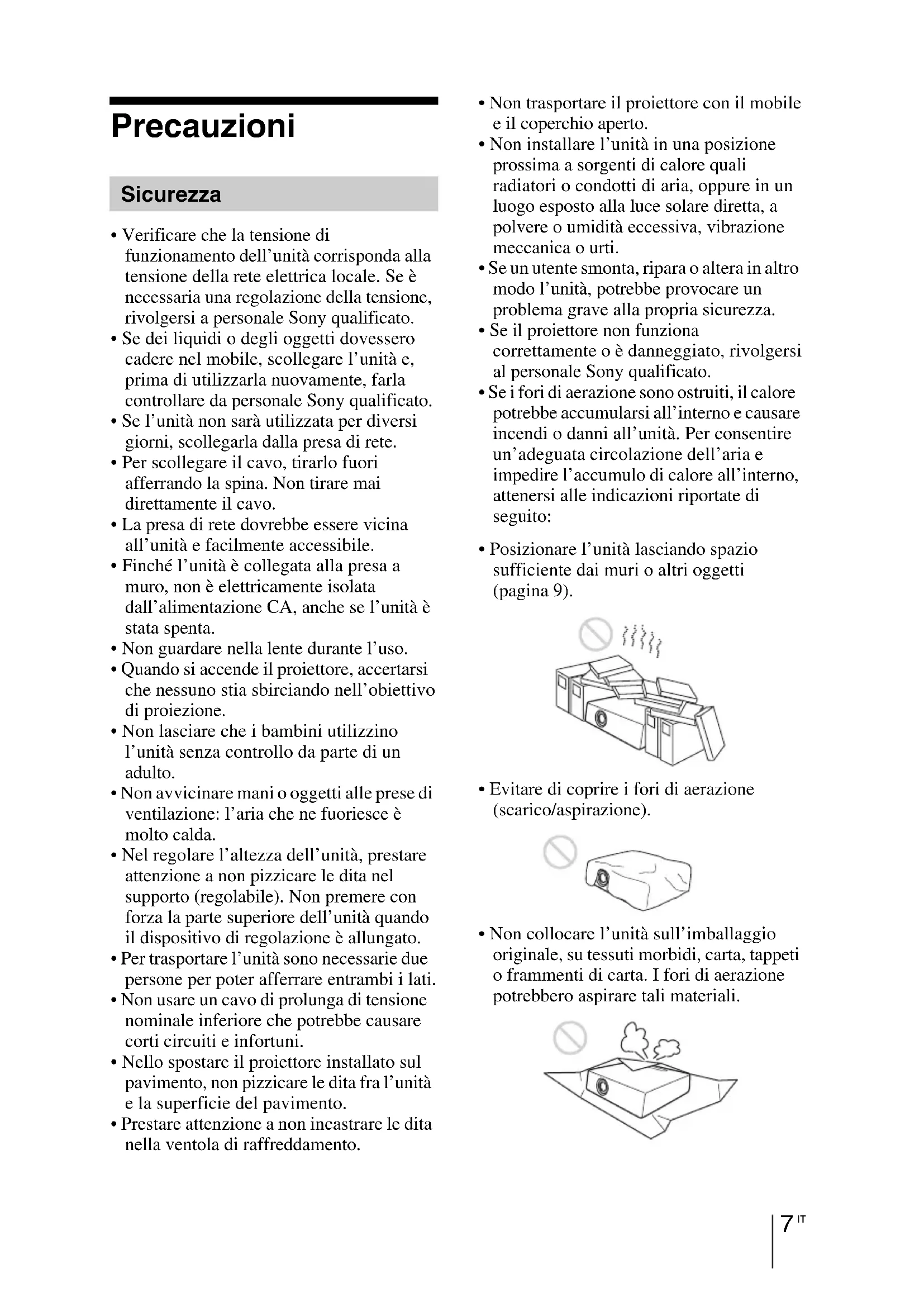 - Non collocare l’unità sull’imballaggio originale, su tessuti morbidi, carta, tappeti o frammenti di carta. I fori di aerazione potrebbero aspirare tali materiali. SicurezzaIT
