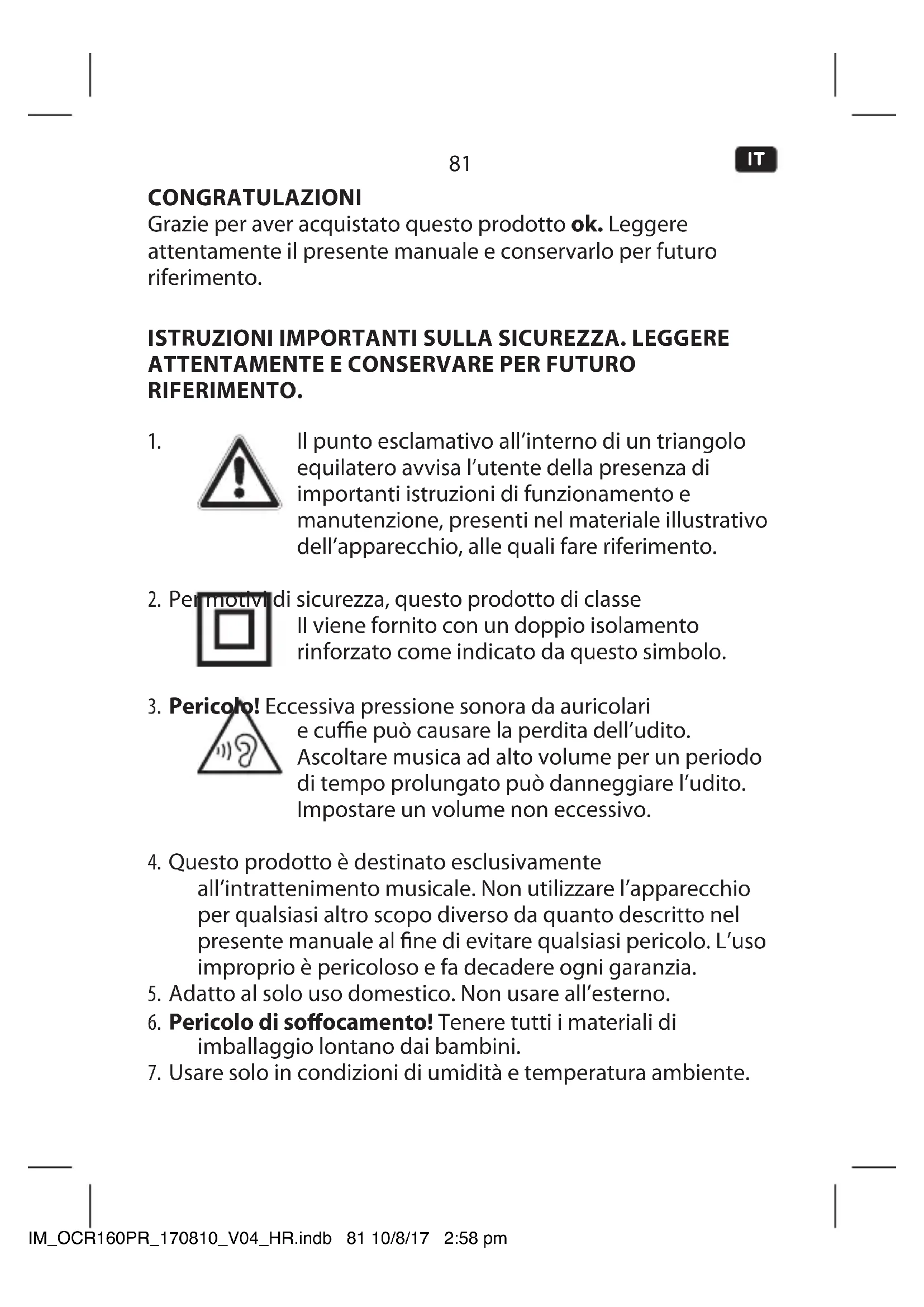 SPECIFICHE Alimentazione : 230 - 240 V~, 50 Hz Consumo energetico durante il funzionamento : 4 W Consumo in Standby : ≤1 W Funzionamento con batterie tampone : 2 x 1,5 V (Typ LR03/AAA) Gamma di sintonizzazione : 87,5 - 108 MHz Griglia di sintonizzazione : 0,1 MHz Classe di protezione : II SMALTIMENTO Non smaltire questo dispositivo come riuti domestici. Restituirlo ad un centro di raccolta per lo smaltimento e di dispositivi elettrici. Contattare il rivenditore o le autorità locali per ulteriori informazioni. Smaltire le batterie rispettando l’ambiente. Non mettere le batterie nei riuti domestici. Usare i sistemi di raccolta e restituzione locali o contattare il rivenditore presso il quale è stato acquistato il prodotto. IM_OCR160PR_170810_V04_HR.indb 93 10/8/17 2:58 pm94