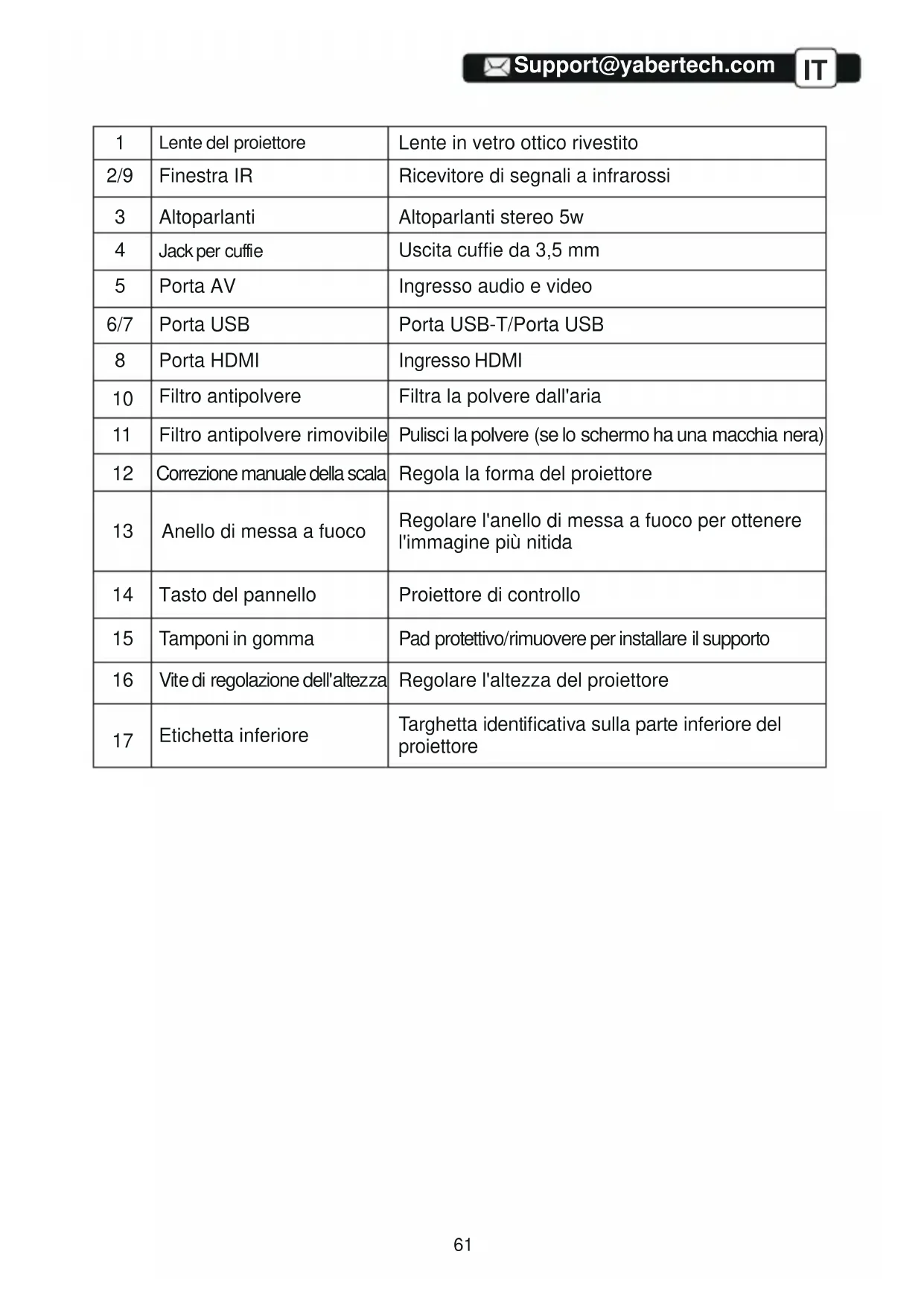 Lente del proiettore Finestra IR Altoparlanti Jack per cuffie Porta AV Porta USB Porta HDMI Filtro antipolvere Filtro antipolvere rimovibile Correzione manuale della scala Anello di messa a fuoco Tasto del pannello Tamponi in gomma Vite di regolazione dell'altezza Etichetta inferiore Lente in vetro ottico rivestito Ricevitore di segnali a infrarossi Altoparlanti stereo 5w Uscita cuffie da 3,5 mm Ingresso audio e video Porta USB-T/Porta USB Ingresso HDMI Filtra la polvere dall'aria Pulisci la polvere (se lo schermo ha una macchia nera) Regola la forma del proiettore Regolare l'anello di messa a fuoco per ottenere l'immagine più nitida Proiettore di controllo Pad protettivo/rimuovere per installare il supporto Regolare l'altezza del proiettore Targhetta identificativa sulla parte inferiore del proiettore