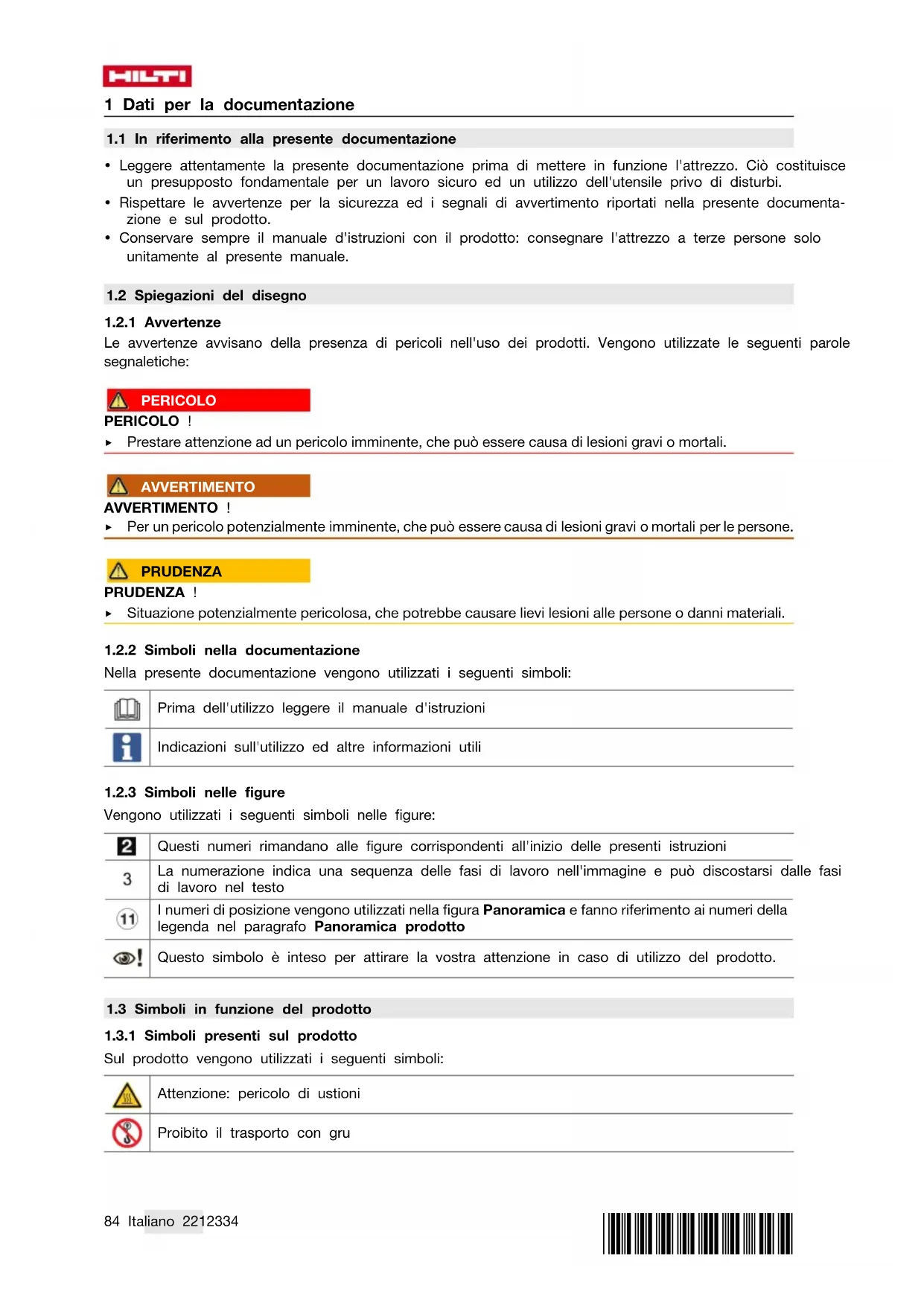 Sotto nostra unica responsabilità, dichiariamo che il prodotto qui descritto è stato realizzato in conformità alle direttive e norme vigenti. L'immagine della dichiarazione di conformità è riportata alla fine della presente documentazione. La documentazione tecnica è depositata qui: Hilti Entwicklungsgesellschaft mbH | Zulassung Geräte | Hiltistraße 6 | 86916 Kaufering, DE 2 Sicurezza