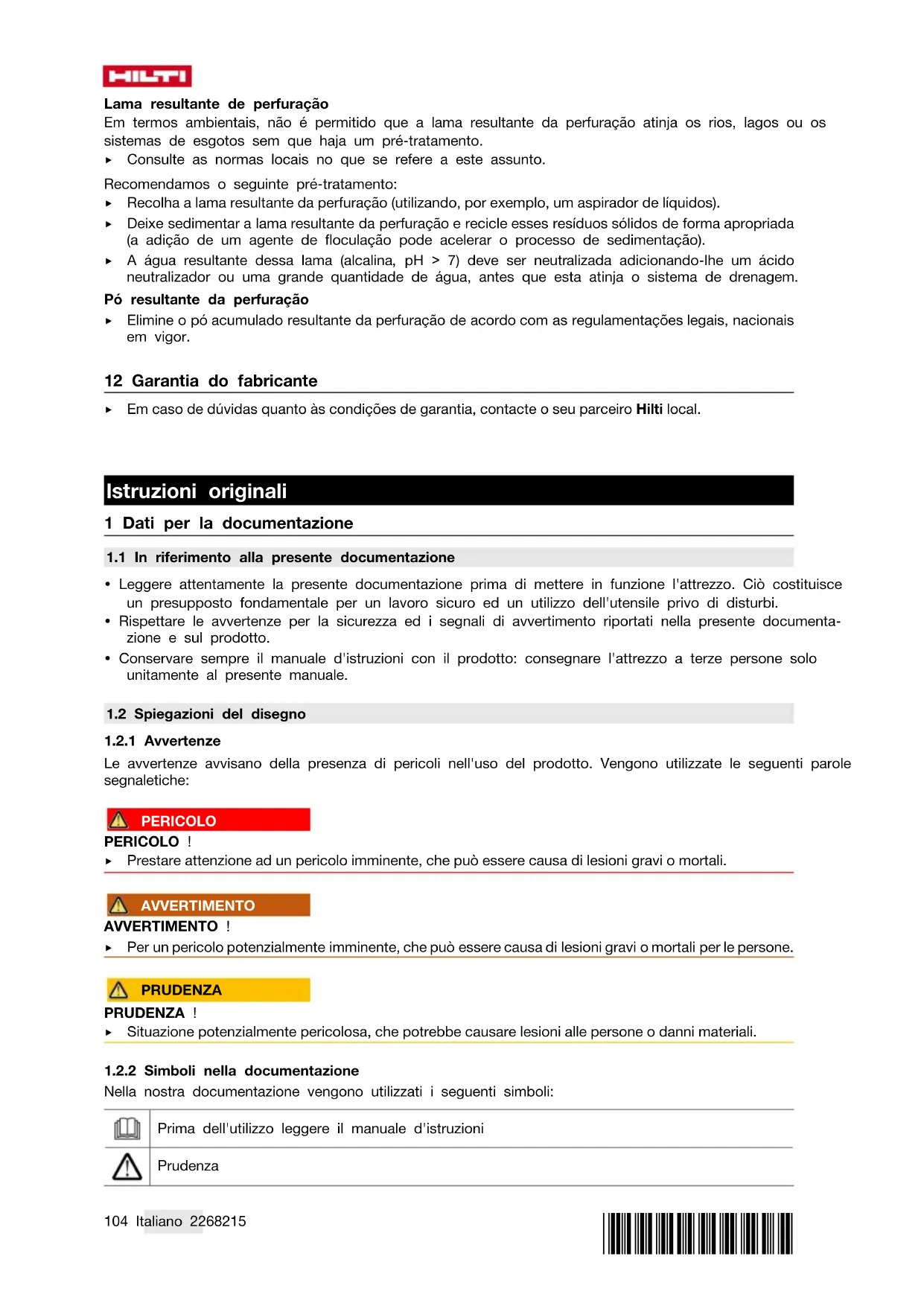 - Pagina 117 Nessun elemento filtrante inserito. ▶ Inserire un elemento filtrante di tipo appropriato. → Pagina 117 L'indicatore di servizio Disin- serimento acqua si accende. Il disinserimento del flusso d'acqua è scattato. ▶ Pulire le sonde e l'area intorno alle sonde con una spazzola. L'indicatore di servizio Po- tenza di aspirazione ridotta si accende. Sacchetto raccoglipolvere pieno. ▶ Sostituire il sacchetto raccogli- polvere. L'elemento filtrante è molto sporco. ▶ Qualora la pulizia automatica del filtro sia disattivata procedere alla riattivazione e lasciare l'aspiratore in funzione per 30 secondi. Il tubo flessibile di aspirazione o il carter di protezione antipolvere dell'elettroutensile è occluso. ▶ Pulire il tubo flessibile di aspirazione o il carter di protezione antipolvere. Regolazione diametro del flessibile in posizione errata. ▶ Impostare il diametro del tubo flessibile → Pagina 115. 11 Smaltimento I prodotti Hilti sono in gran parte realizzati con materiali riciclabili. Condizione essenziale per il riciclaggio è che i materiali vengano accuratamente separati. In molti Paesi Hilti ritira il vostro vecchio attrezzo. Rivolgetevi al centro assistenza Hilti oppure al vostro referente Hilti. Secondo la Direttiva Europea sui rifiuti di apparecchiature elettriche ed elettroniche e la sua attuazione in conformità alle norme nazionali, le apparecchiature elettriche esauste devono essere raccolte separatamente, al fine di essere reimpiegate in modo ecocompatibile.*2268215* 2268215 Dansk 121 ▶ Non gettare le apparecchiature elettriche tra i rifiuti domestici! Fango di perforazione Dal punto di vista della tutela dell'ambiente è problematico lasciar fluire direttamente i fanghi di perforazione nei corsi d'acqua oppure nella rete fognaria senza un adeguato pre-trattamento. ▶ Richiedere informazioni alle autorità locali in merito alle normative vigenti. Si suggerisce il seguente pre-trattamento: ▶ Raccogliere il fango di foratura (ad esempio con aspiratore per liquidi). ▶ Lasciare depositare il fango di perforazione e smaltire la parte solida in una discarica per calcinacci (agenti flocculanti possono accelerare il processo di deposizione). ▶ Prima di smaltire nelle fognature l'acqua residua (basica, pH > 7), neutralizzarla aggiungendo un neutralizzatore acido o diluendola con molta acqua. Polvere di foratura ▶ Smaltire la polvere di foratura raccolta in conformità alle vigenti prescrizioni nazionali di legge. 12 Garanzia del costruttore ▶ In caso di domande sulle condizioni di garanzia, rivolgersi al partner Hilti locale. Original brugsanvisning 1 Oplysninger vedrørende dokumentationen