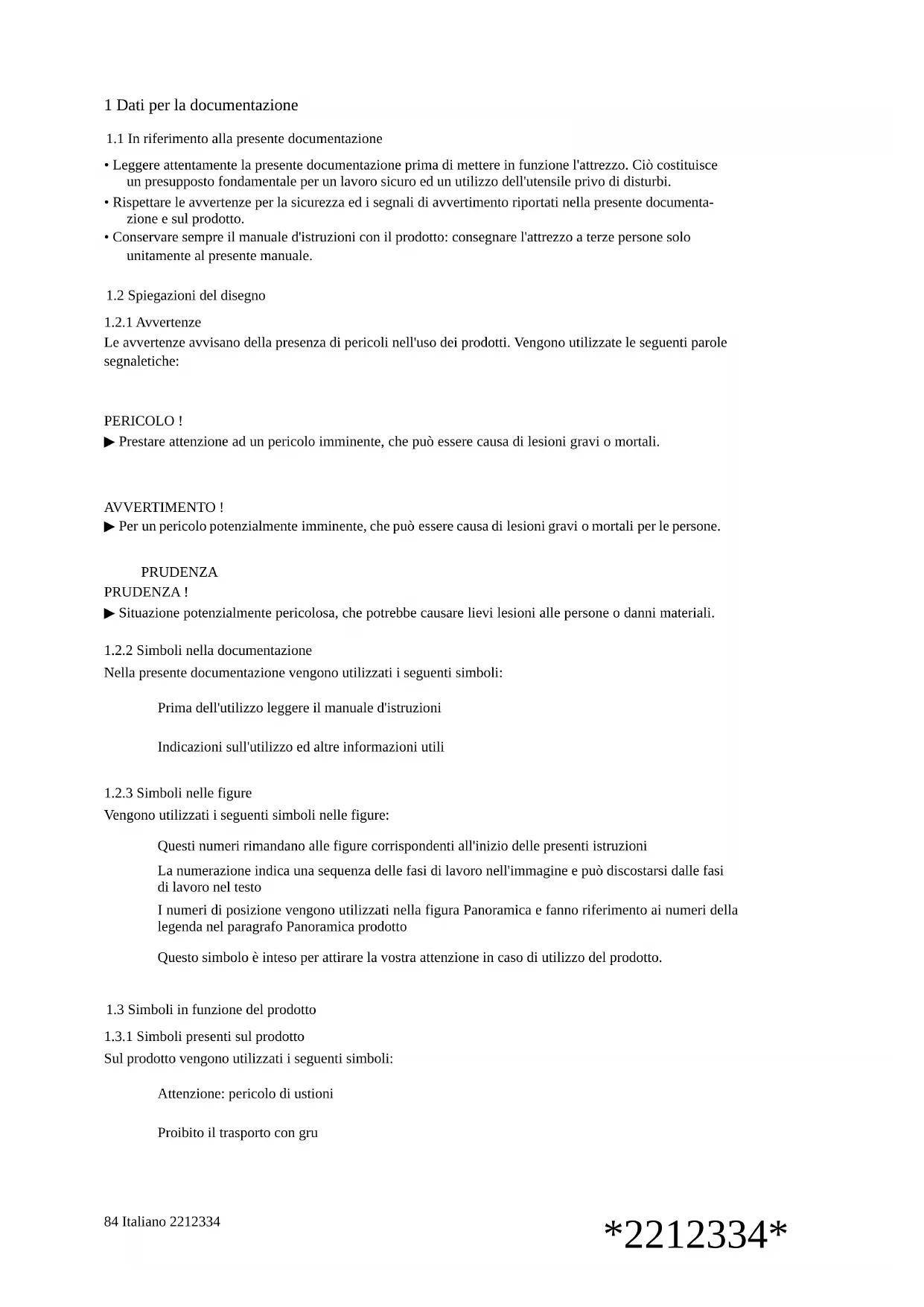Sul prodotto vengono utilizzati i seguenti simboli: Attenzione: pericolo di ustioni Proibito il trasporto con gru*2212334* 2212334 Italiano 85