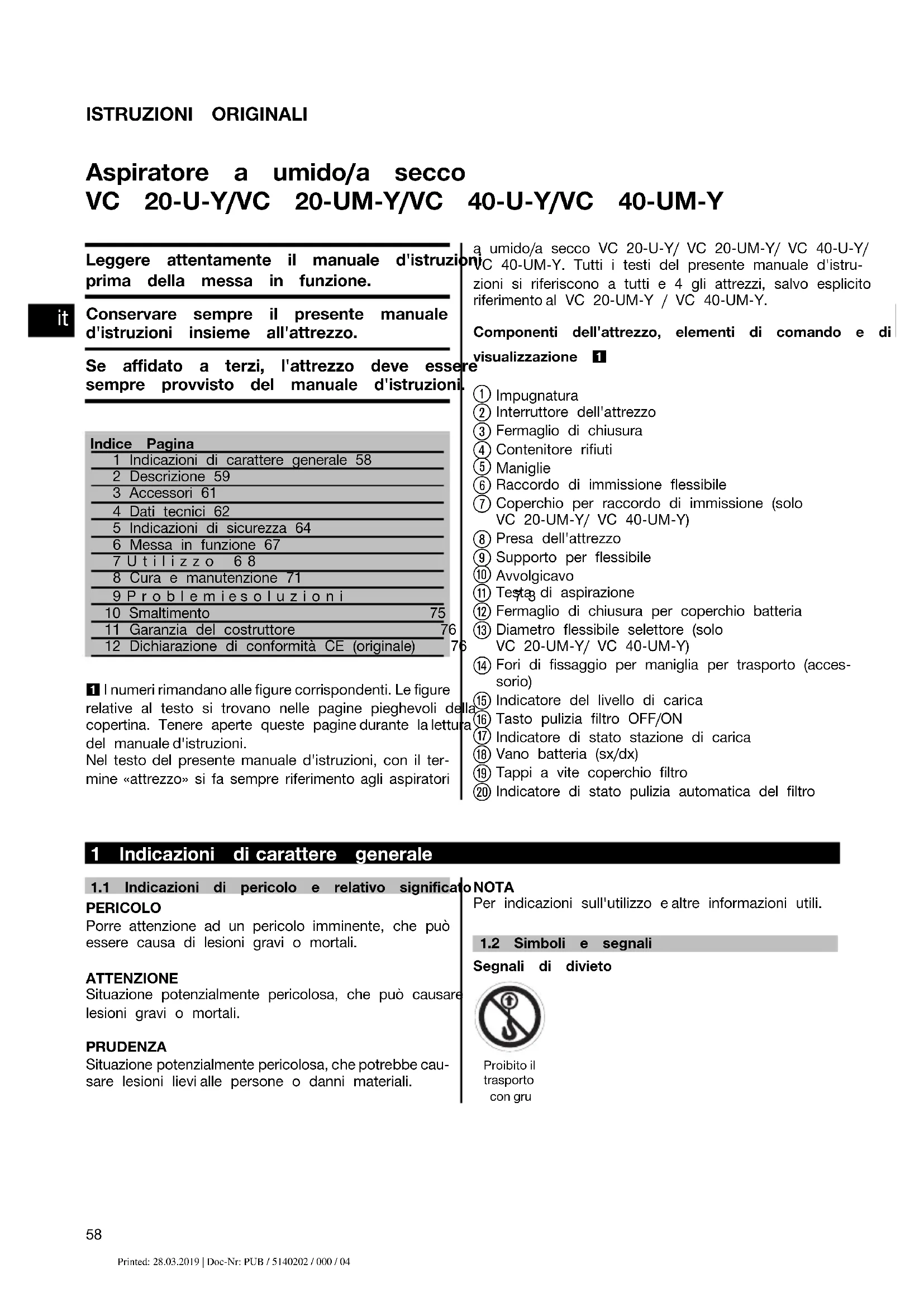 Printed: 24.03.2014 | Doc-Nr: PUB / 5140202 / 000 / 03 Printed: 28.03.2019 | Doc-Nr: PUB / 5140202 / 000 / 04ISTRUZIONI ORIGINALI Aspiratore a umido/a secco VC 20-U‑Y/VC 20-UM‑Y/VC 40-U‑Y/VC 40-UM‑Y Leggere attentamente il manuale d'istruzioni prima della messa in funzione. Conservare sempre il presente manuale d'istruzioni insieme all'attrezzo. Se affidato a terzi, l'attrezzo deve essere sempre provvisto del manuale d'istruzioni. Indice Pagina1 Indicazioni di carattere generale 582 Descrizione 593 Accessori 614 Dati tecnici 625 Indicazioni di sicurezza 646 Messa in funzione 677Utilizzo 688 Cura e manutenzione 719Problemiesoluzioni 7310 Smaltimento 7511 Garanzia del costruttore 7612 Dichiarazione di conformità CE (originale) 76 1 I numeri rimandano alle figure corrispondenti. Le figure relative al testo si trovano nelle pagine pieghevoli dellacopertina. Tenere aperte queste pagine durante la letturadel manuale d'istruzioni. Nel testo del presente manuale d'istruzioni, con il ter- mine «attrezzo» si fa sempre riferimento agli aspiratori a umido/a secco VC 20‑U‑Y/ VC 20‑UM‑Y/ VC 40‑U‑Y/VC 40‑UM‑Y. Tutti i testi del presente manuale d'istru-zioni si riferiscono a tutti e 4 gli attrezzi, salvo esplicitoriferimento al VC 20‑UM‑Y / VC 40‑UM‑Y.Componenti dell'attrezzo, elementi di comando e divisualizzazione 1 Impugnatura Interruttore dell'attrezzo Fermaglio di chiusura Contenitore rifiuti Maniglie Raccordo di immissione flessibile Coperchio per raccordo di immissione (soloVC 20‑UM‑Y/ VC 40‑UM‑Y) Presa dell'attrezzo Supporto per flessibile Avvolgicavo Testa di aspirazione Fermaglio di chiusura per coperchio batteria Diametro flessibile selettore (soloVC 20‑UM‑Y/ VC 40‑UM‑Y) Fori di fissaggio per maniglia per trasporto (acces-sorio) Indicatore del livello di carica Tasto pulizia filtro OFF/ON Indicatore di stato stazione di carica Vano batteria (sx/dx) Tappi a vite coperchio filtro Indicatore di stato pulizia automatica del filtro 1 Indicazioni di carattere generale