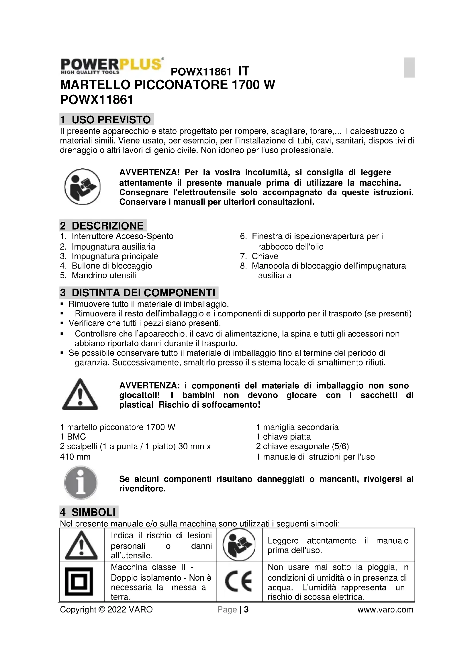 POWX11861 1 USO PREVISTO II presente apparecchio e stato progettato per rompere, scagliare, forare,... il calcestruzzo o materiali simili. Viene usato, per esempio, per l’installazione di tubi, cavi, sanitari, dispositivi di drenaggio o altri lavori di genio civile. Non idoneo per l'uso professionale. AVVERTENZA! Per la vostra incolumità, si consiglia di leggere attentamente il presente manuale prima di utilizzare la macchina. Consegnare l’elettroutensile solo accompagnato da queste istruzioni. Conservare i manuali per ulteriori consultazioni. 2 DESCRIZIONE