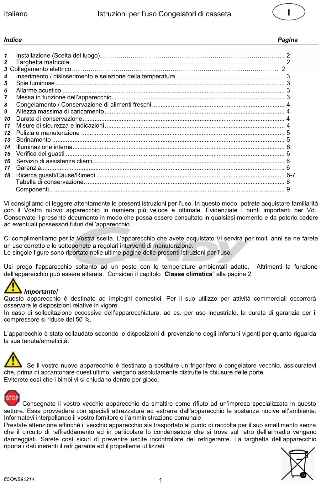 - Componenti Vi consigliamo di leggere attentamente le presenti istruzioni per l’uso. In questo modo, potrete acquistare familiarità con il Vostro nuovo apparecchio in maniera più veloce e ottimale. Evidenziate i punti importanti per Voi. Conservate il presente documento in modo che possa essere consultato in qualsiasi momento e da poterlo cedere ad eventuali possessori futuri dell’apparecchio. Ci complimentiamo per la Vostra scelta. L’apparecchio che avete acquistato Vi servirà per molti anni se ne farete un uso corretto e lo sottoporrete a regolari interventi di manutenzione. Le singole figure sono riportate nelle ultime pagine delle presenti istruzioni per l’uso. Usi prego l'apparecchio soltanto ad un posto con le temperature ambientali adatte. Altrimenti la funzione dell'apparecchio può essere alterata. Consideri il capitolo "Classe climatica" alla pagina 2. Importante! Questo apparecchio è destinato ad impieghi domestici. Per il suo utilizzo per attività commerciali occorrerà osservare le disposizioni relative in vigore. In caso di sollecitazione eccessiva dell’apparecchiatura, ad es. per uso industriale, la durata di garanzia per il compressore si riduce del 50 %. L’apparecchio è stato collaudato secondo le disposizioni di prevenzione degli infortuni vigenti per quanto riguarda la sua tenuta/ermeticità. Se il vostro nuovo apparecchio è destinato a sostituire un frigorifero o congelatore vecchio, assicuratevi che, prima di accantonare quest’ultimo, vengano assolutamente distrutte le chiusure delle porte. Eviterete così che i bimbi vi si chiudano dentro per gioco. Consegnate il vostro vecchio apparecchio da smaltire come rifiuto ad un’impresa specializzata in questo settore. Essa provvederà con speciali attrezzature ad estrarre dall’apparecchio le sostanze nocive all’ambiente. Informatevi interpellando il vostro fornitore o l’amministrazione comunale. Prestate attenzione affinché il vecchio apparecchio sia trasportato al punto di raccolta per il suo smaltimento senza che il circuito di raffreddamento ed in particolare lo condensatore che si trova sul retro dell‘armadio vengano danneggiati. Sarete così sicuri di prevenire uscite incontrollate del refrigerante. La targhetta dell’apparecchio riporta i dati inerenti il refrigerante ed il propellente utilizzati.Italiano Istruzioni per l’uso Congelatori di casseta fiCONS91214 p. 9