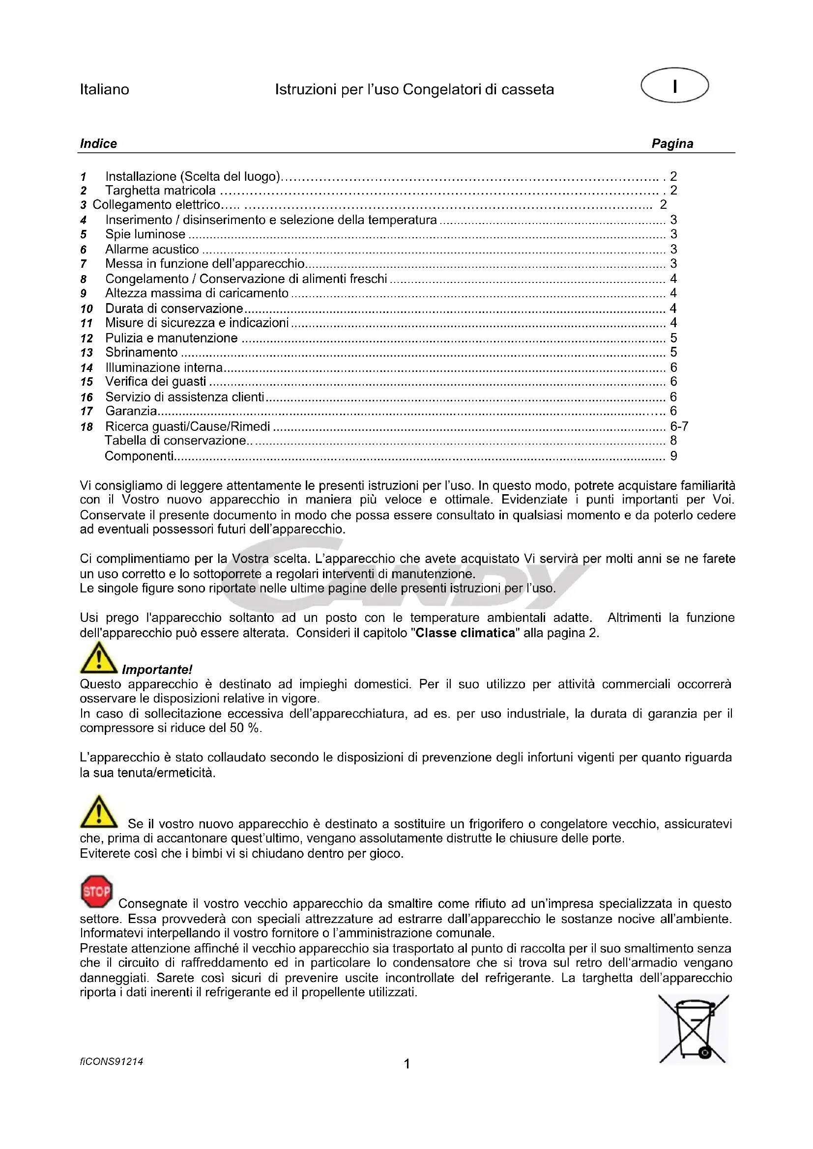 - Componenti Vi consigliamo di leggere attentamente le presenti istruzioni per l’uso. In questo modo, potrete acquistare familiarità con il Vostro nuovo apparecchio in maniera più veloce e ottimale. Evidenziate i punti importanti per Voi. Conservate il presente documento in modo che possa essere consultato in qualsiasi momento e da poterlo cedere ad eventuali possessori futuri dell’apparecchio. Ci complimentiamo per la Vostra scelta. L’apparecchio che avete acquistato Vi servirà per molti anni se ne farete un uso corretto e lo sottoporrete a regolari interventi di manutenzione. Le singole figure sono riportate nelle ultime pagine delle presenti istruzioni per l’uso. Usi prego l'apparecchio soltanto ad un posto con le temperature ambientali adatte. Altrimenti la funzione dell'apparecchio può essere alterata. Consideri il capitolo "Classe climatica" alla pagina 2. Importante! Questo apparecchio è destinato ad impieghi domestici. Per il suo utilizzo per attività commerciali occorrerà osservare le disposizioni relative in vigore. In caso di sollecitazione eccessiva dell’apparecchiatura, ad es. per uso industriale, la durata di garanzia per il compressore si riduce del 50 %. L’apparecchio è stato collaudato secondo le disposizioni di prevenzione degli infortuni vigenti per quanto riguarda la sua tenuta/ermeticità. Se il vostro nuovo apparecchio è destinato a sostituire un frigorifero o congelatore vecchio, assicuratevi che, prima di accantonare quest’ultimo, vengano assolutamente distrutte le chiusure delle porte. Eviterete così che i bimbi vi si chiudano dentro per gioco. Consegnate il vostro vecchio apparecchio da smaltire come rifiuto ad un’impresa specializzata in questo settore. Essa provvederà con speciali attrezzature ad estrarre dall’apparecchio le sostanze nocive all’ambiente. Informatevi interpellando il vostro fornitore o l’amministrazione comunale. Prestate attenzione affinché il vecchio apparecchio sia trasportato al punto di raccolta per il suo smaltimento senza che il circuito di raffreddamento ed in particolare lo condensatore che si trova sul retro dell‘armadio vengano danneggiati. Sarete così sicuri di prevenire uscite incontrollate del refrigerante. La targhetta dell’apparecchio riporta i dati inerenti il refrigerante ed il propellente utilizzati.Italiano Istruzioni per l’uso Congelatori di casseta fiCONS91214 p. 9