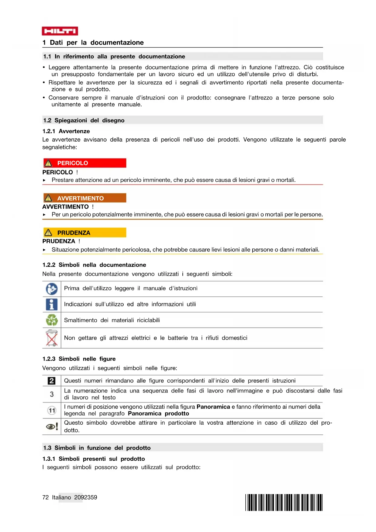 Sotto nostra unica responsabilità, dichiariamo che il prodotto qui descritto è stato realizzato in conformità alle direttive e norme vigenti. L'immagine della dichiarazione di conformità è riportata alla fine della presente documentazione. Le documentazioni tecniche sono archiviate qui: Hilti Entwicklungsgesellschaft mbH | Zulassung Geräte | Hiltistraße 6 | 86916 Kaufering, DE 2 Sicurezza