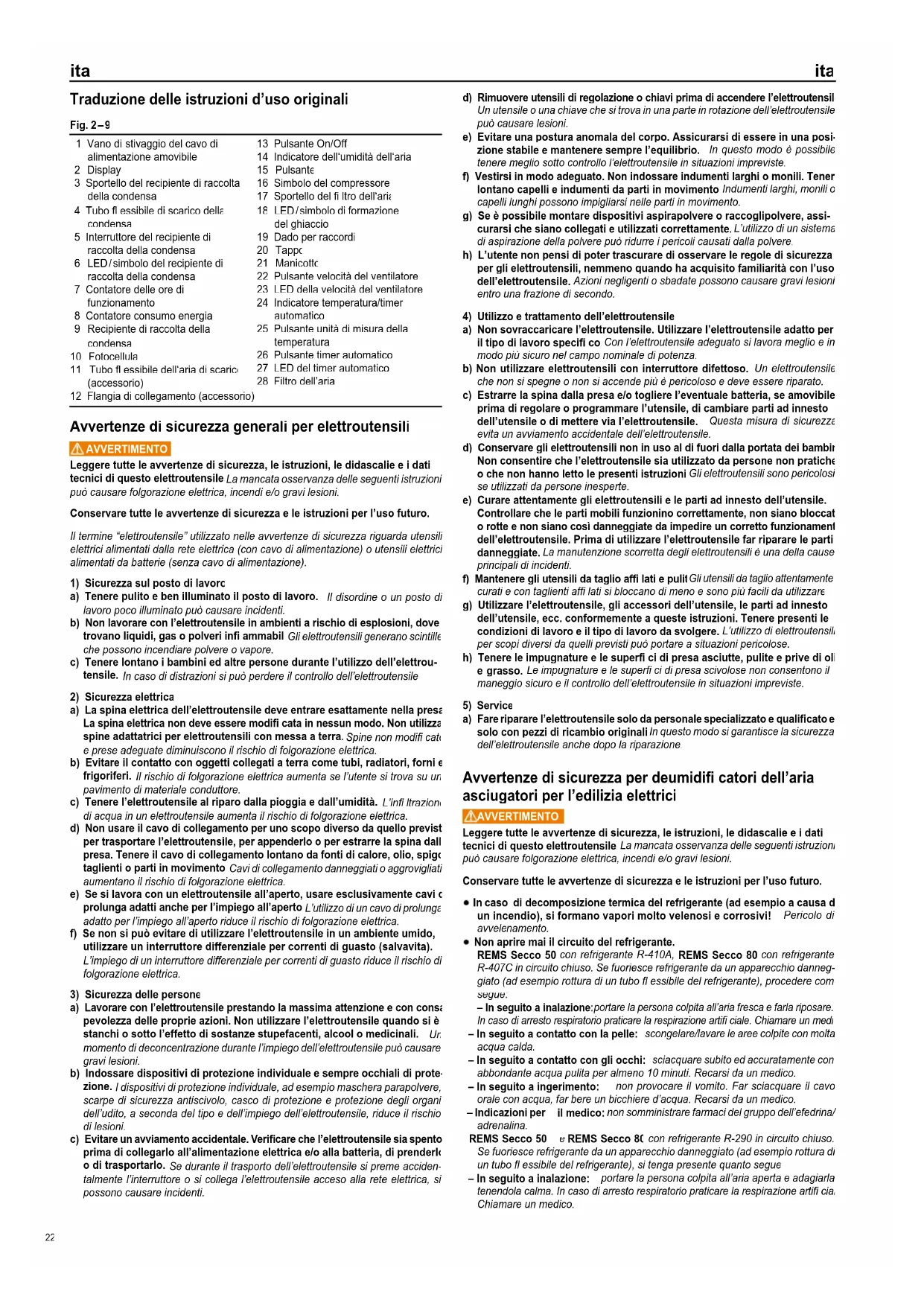 Al termine del loro utilizzo, REMS Secco 50 e il refrigerante R-410A o R-290, REMS Secco 80 e il refrigerante R-407C o R-290, il recipiente di raccolta della condensa con pompa Secco 50, il recipiente di raccolta della condensa con pompa Secco 80, il contatore delle ore di funzionamento e il contatore del consumo di energia elettrica e le pile non devono essere smaltiti insieme ai rifi uti domestici. Queste devono essere smaltiti correttamente e secondo le disposizioni di legge.