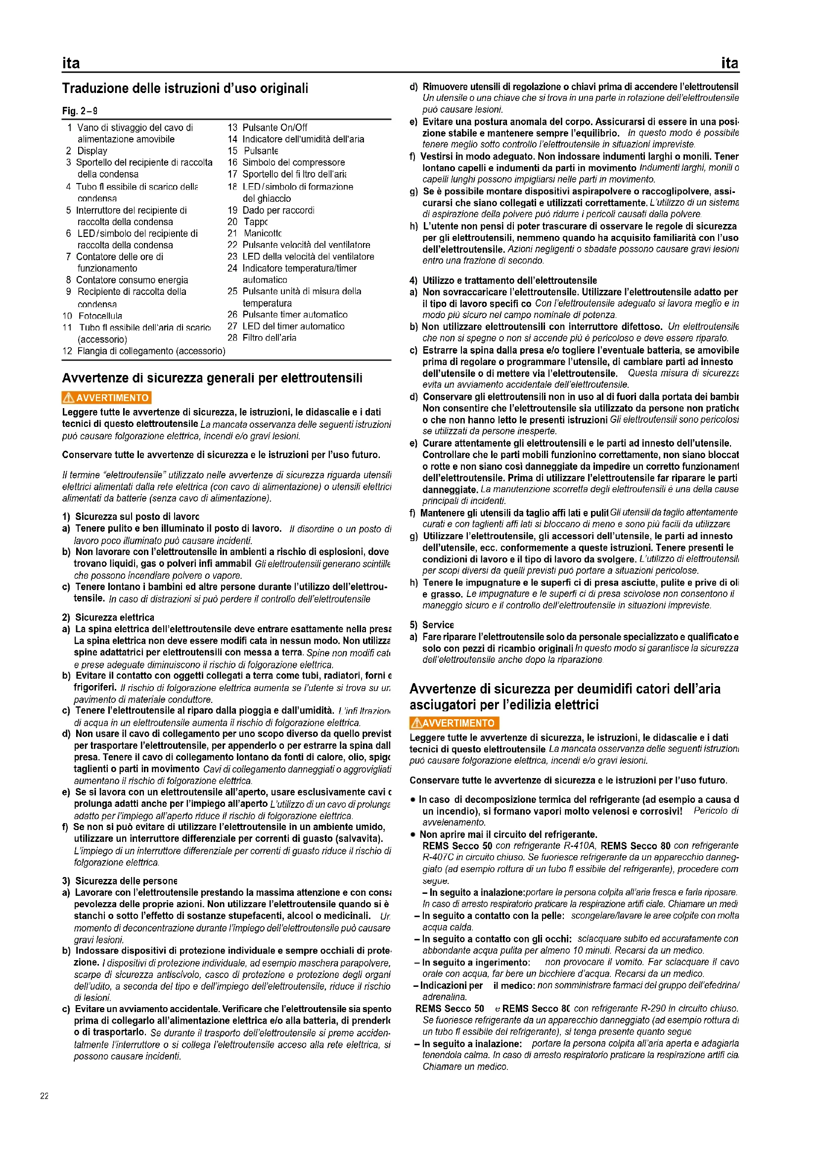 Al termine del loro utilizzo, REMS Secco 50 e il refrigerante R-410A o R-290, REMS Secco 80 e il refrigerante R-407C o R-290, il recipiente di raccolta della condensa con pompa Secco 50, il recipiente di raccolta della condensa con pompa Secco 80, il contatore delle ore di funzionamento e il contatore del consumo di energia elettrica e le pile non devono essere smaltiti insieme ai rifi uti domestici. Queste devono essere smaltiti correttamente e secondo le disposizioni di legge.