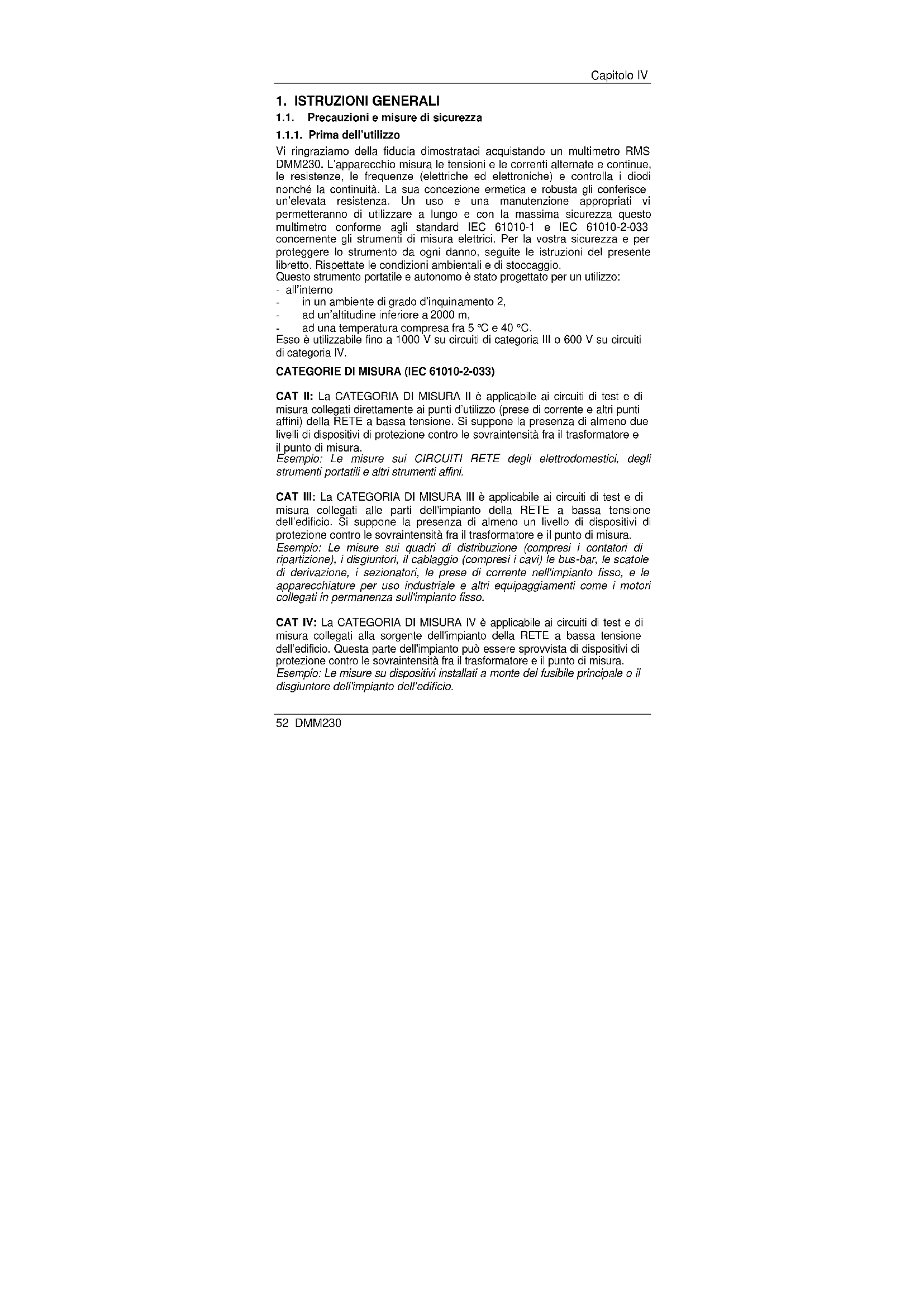 Vi ringraziamo della fiducia dimostrataci acquistando un multimetro RMS DMM230. L’apparecchio misura le tensioni e le correnti alternate e continue, le resistenze, le frequenze (elettriche ed elettroniche) e controlla i diodi nonché la continuità. La sua concezione ermetica e robusta gli conferisce un’elevata resistenza. Un uso e una manutenzione appropriati vi permetteranno di utilizzare a lungo e con la massima sicurezza questo multimetro conforme agli standard IEC 61010-1 e IEC 61010-2-033 concernente gli strumenti di misura elettrici. Per la vostra sicurezza e per proteggere lo strumento da ogni danno, seguite le istruzioni del presente libretto. Rispettate le condizioni ambientali e di stoccaggio. Questo strumento portatile e autonomo è stato progettato per un utilizzo: - all’interno - in un ambiente di grado d’inquinamento 2, - ad un’altitudine inferiore a 2000 m, - ad una temperatura compresa fra 5 °C e 40 °C. Esso è utilizzabile fino a 1000 V su circuiti di categoria III o 600 V su circuiti di categoria IV. CATEGORIE DI MISURA (IEC 61010-2-033) CAT II: La CATEGORIA DI MISURA II è applicabile ai circuiti di test e di misura collegati direttamente ai punti d’utilizzo (prese di corrente e altri punti affini) della RETE a bassa tensione. Si suppone la presenza di almeno due livelli di dispositivi di protezione contro le sovraintensità fra il trasformatore e il punto di misura. Esempio: Le misure sui CIRCUITI RETE degli elettrodomestici, degli strumenti portatili e altri strumenti affini. CAT III: La CATEGORIA DI MISURA III è applicabile ai circuiti di test e di misura collegati alle parti dell'impianto della RETE a bassa tensione dell’edificio. Si suppone la presenza di almeno un livello di dispositivi di protezione contro le sovraintensità fra il trasformatore e il punto di misura. Esempio: Le misure sui quadri di distribuzione (compresi i contatori di ripartizione), i disgiuntori, il cablaggio (compresi i cavi) le bus-bar, le scatole di derivazione, i sezionatori, le prese di corrente nell'impianto fisso, e le apparecchiature per uso industriale e altri equipaggiamenti come i motori collegati in permanenza sull'impianto fisso. CAT IV: La CATEGORIA DI MISURA IV è applicabile ai circuiti di test e di misura collegati alla sorgente dell'impianto della RETE a bassa tensione dell’edificio. Questa parte dell'impianto può essere sprovvista di dispositivi di protezione contro le sovraintensità fra il trasformatore e il punto di misura. Esempio: Le misure su dispositivi installati a monte del fusibile principale o il disgiuntore dell'impianto dell’edificio.Capitolo IV DMM230 53
