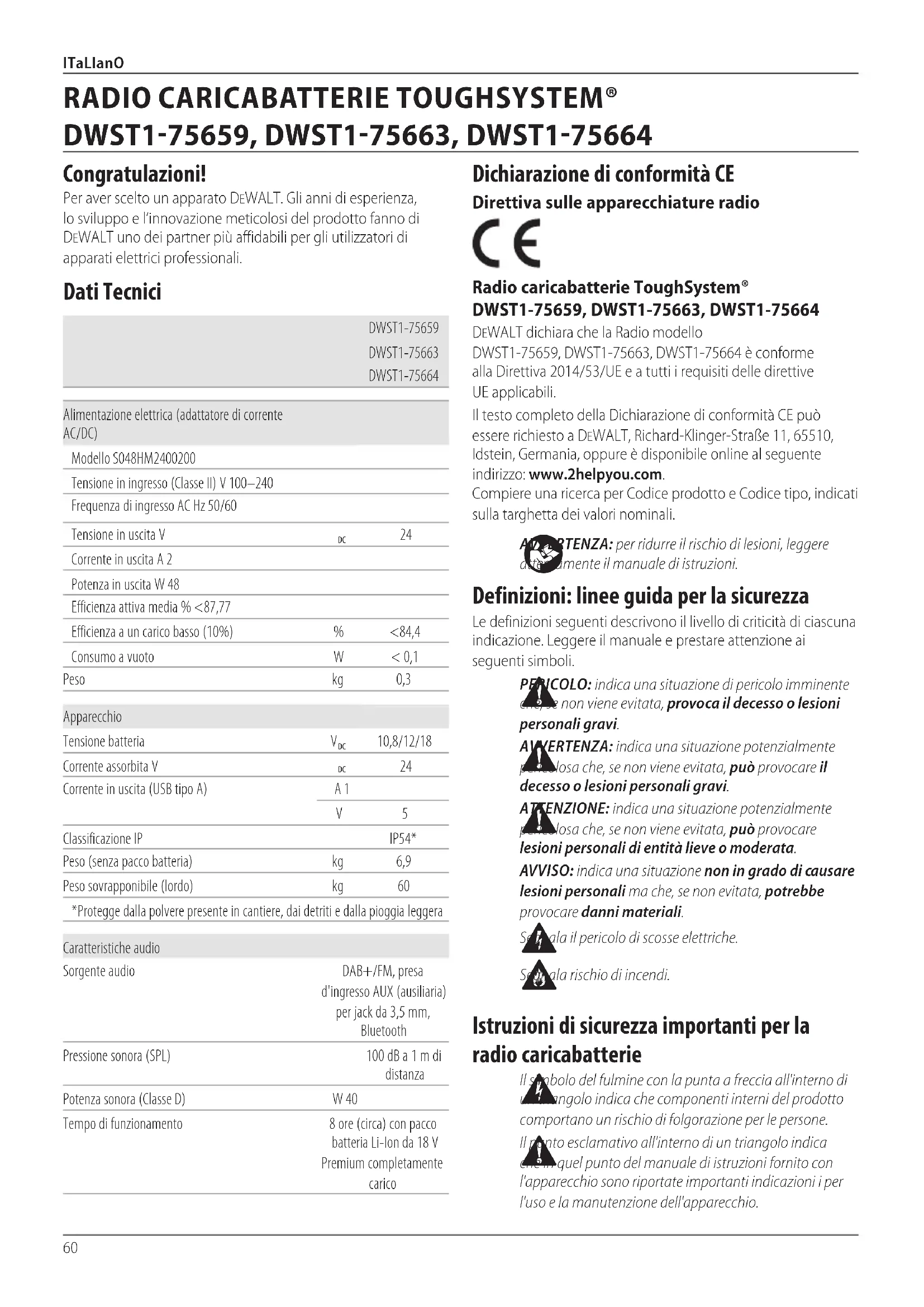 DeWALT dichiara che la Radio modello DWST1-75659, DWST1-75663, DWST1-75664 è conforme alla Direttiva 2014/53/UE e a tutti i requisiti delle direttive UEapplicabili.Il testo completo della Dichiarazione di conformità CE può essere richiesto a DeWALT, Richard-Klinger-Straße 11, 65510, Idstein, Germania, oppure è disponibile online al seguente indirizzo: www.2helpyou.com. Compiere una ricerca per Codice prodotto e Codice tipo, indicati sulla targhetta dei valorinominali.DWST1-75659DWST1-75663DWST1-75664Alimentazione elettrica (adattatore di corrente AC/DC)Modello S048HM2400200Tensione in ingresso (Classe II) V 100–240Frequenza di ingresso AC Hz 50/60Tensione in uscita V