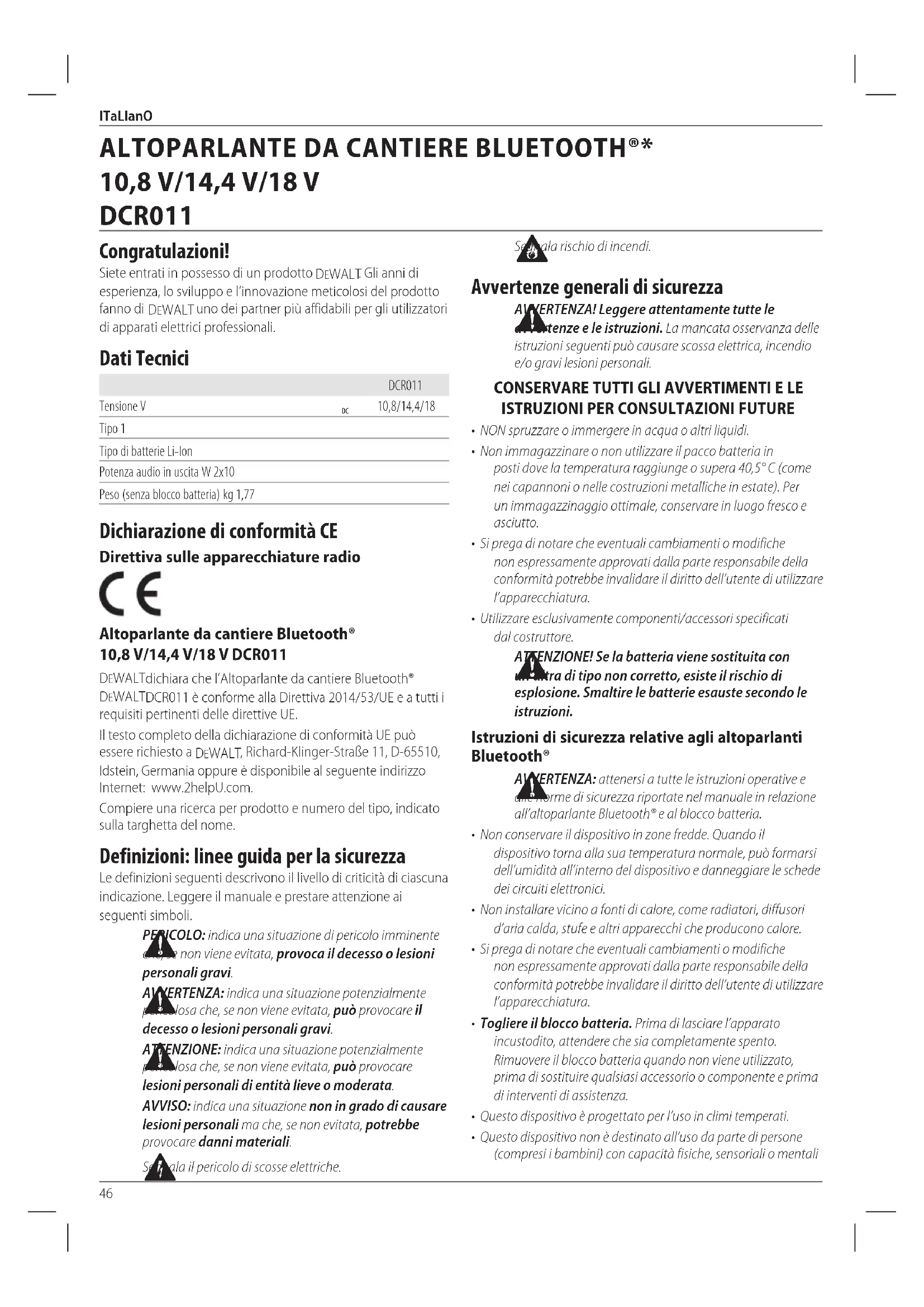 Codice data Uso previsto Questo altoparlante Bluetooth® DeWALT è concepito per riprodurre/ascoltare in streaming contenuti audio tramite una connessione wireless a un cellulare o un altro dispositivo audio. nOn utilizzare l’apparecchio in presenza di acqua, liquidi infiammabili ogas. nOn consentire ai bambini di venire in contatto con l’apparecchio. L’uso di questo apparecchio da parte di persone inesperte deve avvenire sottosorveglianza.