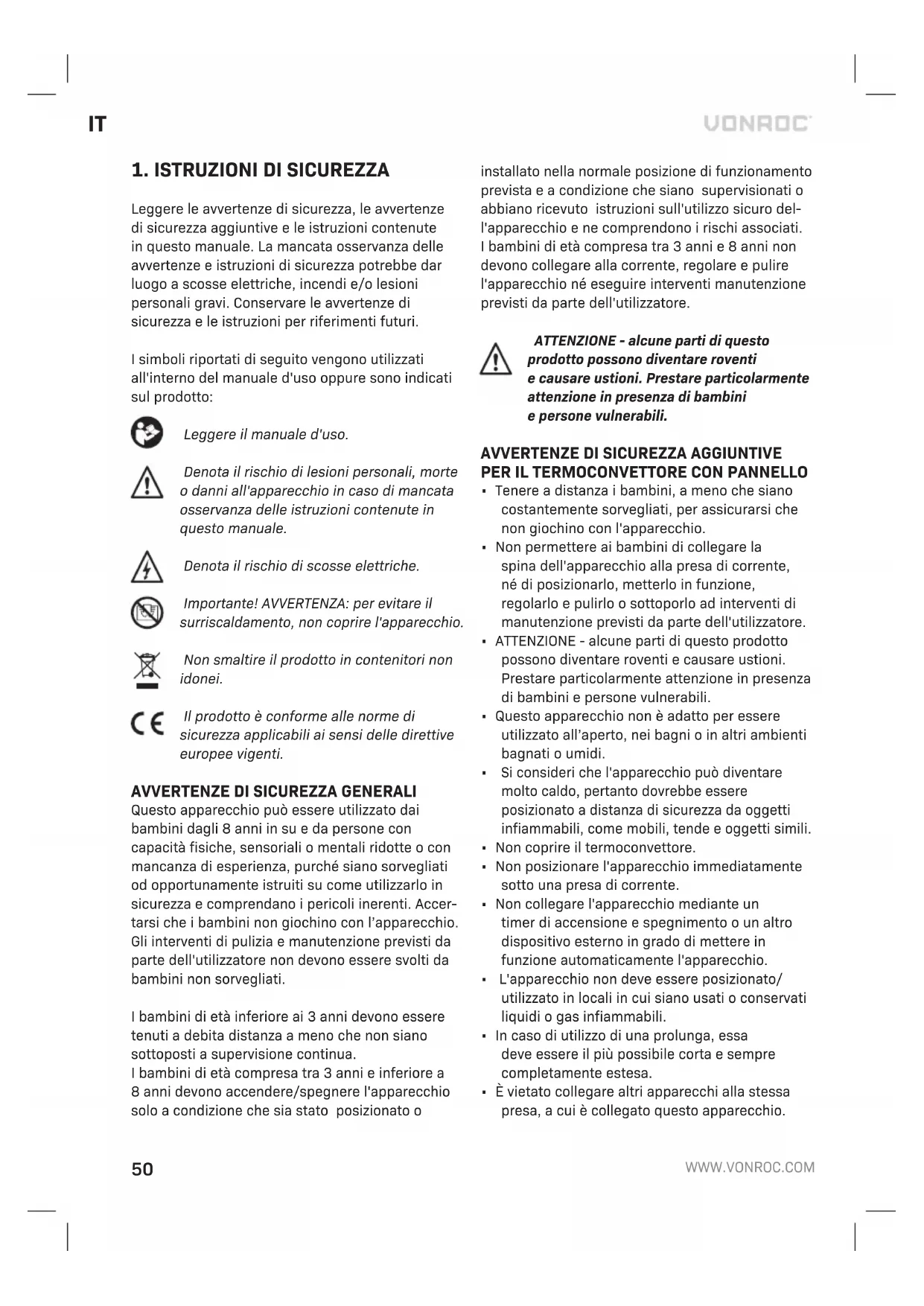 - Riporre il termoconvettore in un ambiente asciutto eben arieggiato. TUTELA AMBIENTALE Le apparecchiature elettriche oelettroniche difettose e/oscartate devono essere raccolte presso gli opportuni siti di riciclaggio. Solo per iPaesi UE Non smaltire gli elettroutensili insieme ai rifiuti do- mestici. Secondo la Direttiva europea 2012/19/EU sui rifiuti delle apparecchiature elettriche ed elet- troniche erelativa implementazione nelle normative locali, gli elettroutensili ormai inutilizzabili devono essere raccolti separatamente esmaltiti in modo ecologico. GARANZIA Iprodotti VONROC sono sviluppati secondo gli stan- dard di qualità più elevati esono garantiti esenti da difetti sia per quanto riguarda imateriali che la lavorazione per il periodo stabilito per legge ade- correre dalla data di acquisto iniziale. Se durante questo periodo il prodotto dovesse presentare dei difetti di materiali e/odi lavorazione, contattare direttamente VONROC. Le seguenti circostanze sono escluse dalla garan- zia: