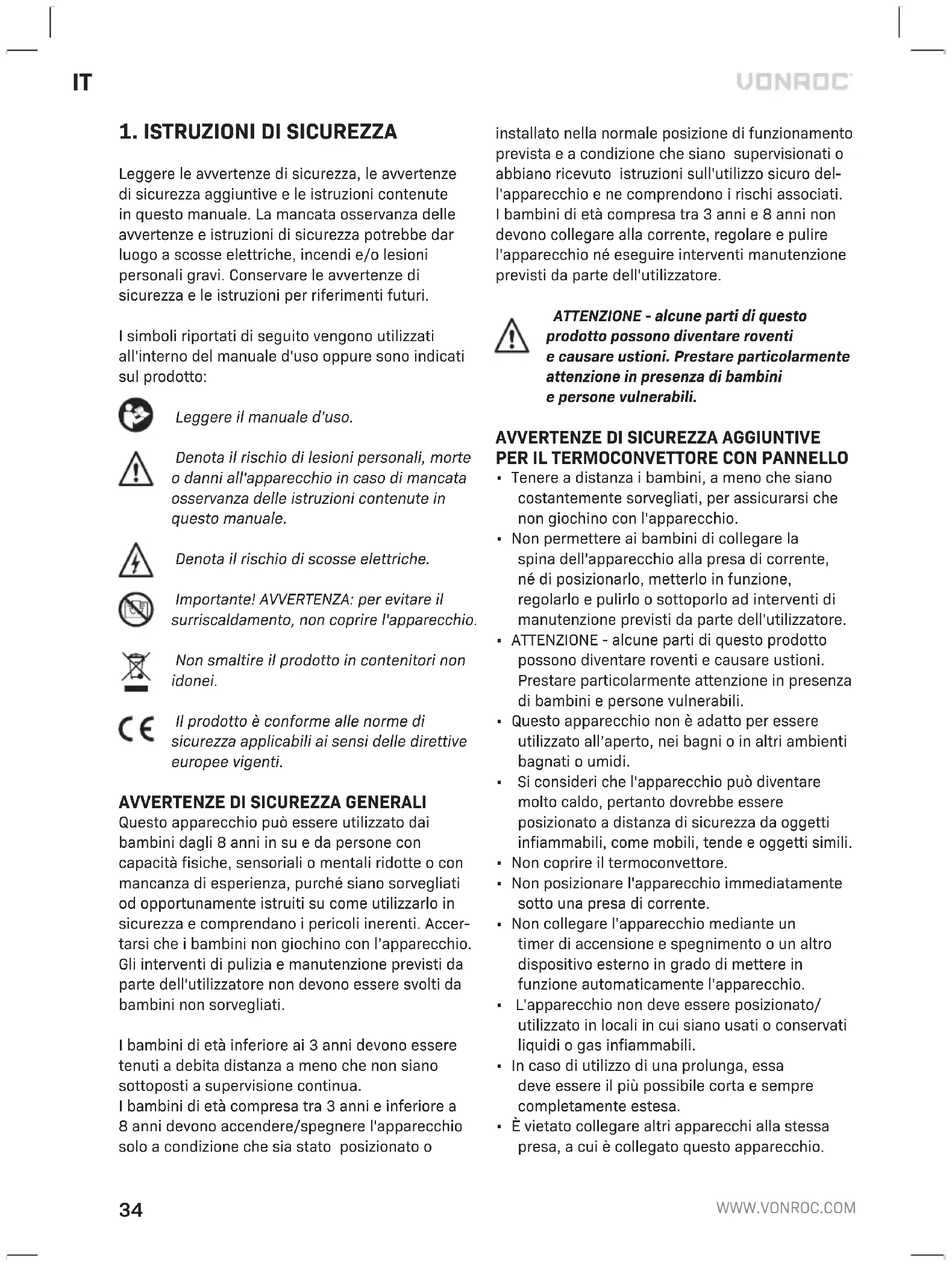 - Riporre il termoconvettore in un ambiente asciutto eben arieggiato. TUTELA AMBIENTALE Le apparecchiature elettriche oelettroniche difettose e/oscartate devono essere raccolte presso gli opportuni siti di riciclaggio. Solo per iPaesi UE Non smaltire gli elettroutensili insieme ai rifiuti do- mestici. Secondo la Direttiva europea 2012/19/EU sui rifiuti delle apparecchiature elettriche ed elet- troniche erelativa implementazione nelle normative locali, gli elettroutensili ormai inutilizzabili devono essere raccolti separatamente esmaltiti in modo ecologico. GARANZIA Iprodotti VONROC sono sviluppati secondo gli stan- dard di qualità più elevati esono garantiti esenti da difetti sia per quanto riguarda imateriali che la lavorazione per il periodo stabilito per legge ade- correre dalla data di acquisto iniziale. Se durante questo periodo il prodotto dovesse presentare dei difetti di materiali e/odi lavorazione, contattare direttamente VONROC. Le seguenti circostanze sono escluse dalla garan- zia: