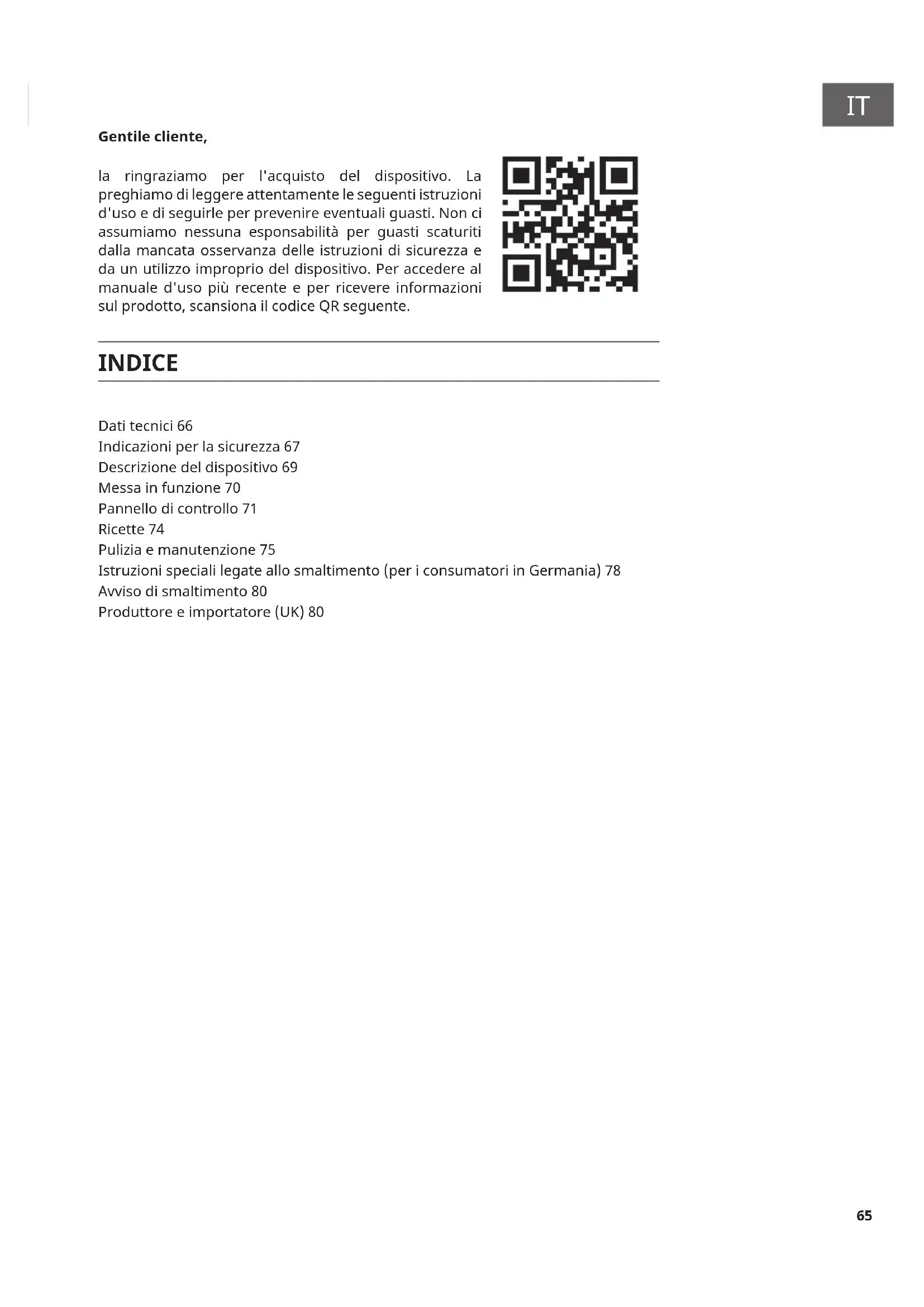Gentile cliente, la ringraziamo per l'acquisto del dispositivo. La preghiamo di leggere attentamente le seguenti istruzioni d'uso e di seguirle per prevenire eventuali guasti. Non ci assumiamo nessuna esponsabilità per guasti scaturiti dalla mancata osservanza delle istruzioni di sicurezza e da un utilizzo improprio del dispositivo. Per accedere al manuale d'uso più recente e per ricevere informazioni sul prodotto, scansiona il codice QR seguente. Dati tecnici 66 Indicazioni per la sicurezza 67 Descrizione del dispositivo 69 Messa in funzione 70 Pannello di controllo 71 Ricette 74 Pulizia e manutenzione 75 Istruzioni speciali legate allo smaltimento (per i consumatori in Germania) 78 Avviso di smaltimento 80 Produttore e importatore (UK) 80 INDICE66