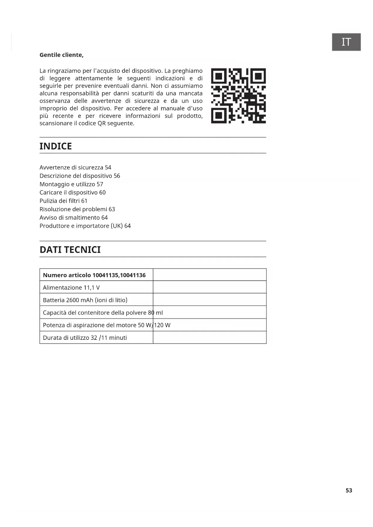 Gentile cliente, La ringraziamo per l'acquisto del dispositivo. La preghiamo di leggere attentamente le seguenti indicazioni e di seguirle per prevenire eventuali danni. Non ci assumiamo alcuna responsabilità per danni scaturiti da una mancata osservanza delle avvertenze di sicurezza e da un uso improprio del dispositivo. Per accedere al manuale d'uso più recente e per ricevere informazioni sul prodotto, scansionare il codice QR seguente. INDICE DATI TECNICI Numero articolo 10041135,10041136 Alimentazione 11,1 V Batteria 2600 mAh (ioni di litio) Capacità del contenitore della polvere 80 ml Potenza di aspirazione del motore 50 W/120 W Durata di utilizzo 32 /11 minuti Avvertenze di sicurezza 54 Descrizione del dispositivo 56 Montaggio e utilizzo 57 Caricare il dispositivo 60 Pulizia dei ltri 61 Risoluzione dei problemi 63 Avviso di smaltimento 64 Produttore e importatore (UK) 6454