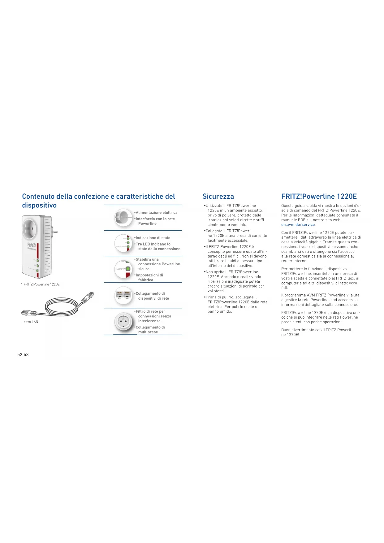- Collegamento di multiprese 1 FRITZ!Powerline1220E 1 cavo LAN FRITZ!Powerline 1220E Questa guida rapida vi mostra le opzioni d’u- so e di comando del FRITZ!Powerline1220E. Per le informazioni dettagliate consultate il manuale PDF sul nostro sito web en.avm.de/service. Con il FRITZ!Powerline1220E potete tra- smettere i dati attraverso la linea elettrica di casa a velocità gigabit. Tramite questa con- nessione, i vostri dispositivi possono anche scambiarsi dati e ottengono sia l’accesso alla rete domestica sia la connessione al router Internet. Per mettere in funzione il dispositivo FRITZ!Powerline, inseritelo in una presa di vostra scelta e connettetelo al FRITZ!Box, al computer e ad altri dispositivi di rete: ecco fatto! Il programma AVM FRITZ!Powerline vi aiuta a gestire la rete Powerline e ad accedere a informazioni dettagliate sulla connessione. FRITZ!Powerline1220E è un dispositivo uni- co che si può integrare nelle reti Powerline preesistenti con poche operazioni. Buon divertimento con il FRITZ!Powerli- ne1220E! 52 53fase (L) neutro (N) conduttore di terra (PE) coppia addizionale coppia standard