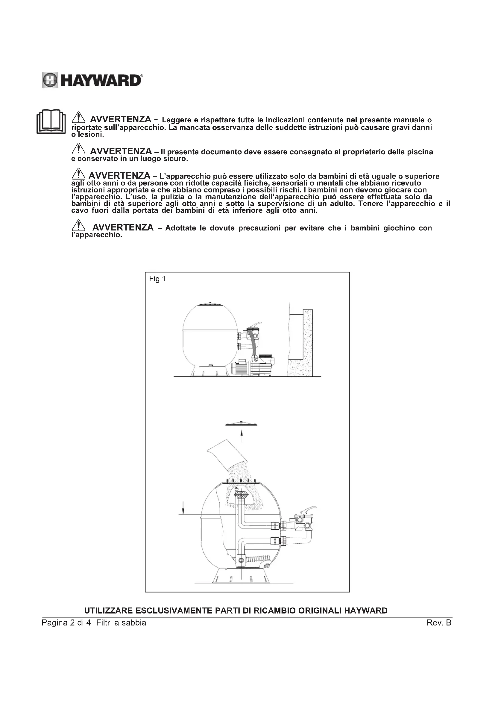 AVVERTENZA – Adottate le dovute precauzioni per evitare che i bambini giochino con l’apparecchio. Fig 1UTILIZZARE ESCLUSIVAMENTE PARTI DI RICAMBIO ORIGINALI HAYWARD Pagina 3 di 4 Filtri a sabbia Rev. B Avete appena acquistato un filtro a sabbia, completo di base e valvola. FUNZIONAMENTO Il filtro utilizza una sabbia speciale che trattiene le particelle di sporco contenute nell’acqua della piscina. La sabbia viene versata nel serbatoio e funge da sistema permanente di filtrazione. L’acqua non filtrata della piscina, che contiene impurità in sospensione, viene aspirata dalla pompa e inviata verso la valvola di controllo multi-vie. Al passaggio dell’acqua attraverso la sabbia, le particelle di sporco vengono imprigionate nel letto di sabbia e l’acqua filtrata ritorna nella piscina. INSTALLAZIONE